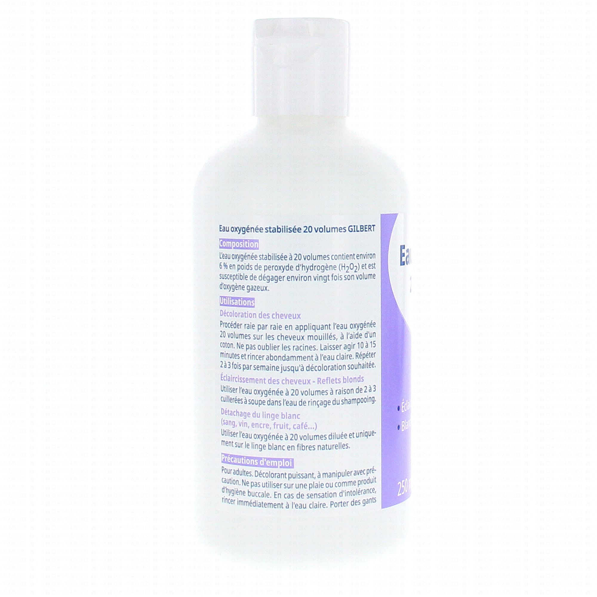 L'eau oxygénée stabilisée à 20 volumes de Gilbert, permet de blanchir le linge, décolorer les cheveux et le duvet, et enlever toute trace de sang, café, fruit ou encre. Conditionnement : flacon plastique.