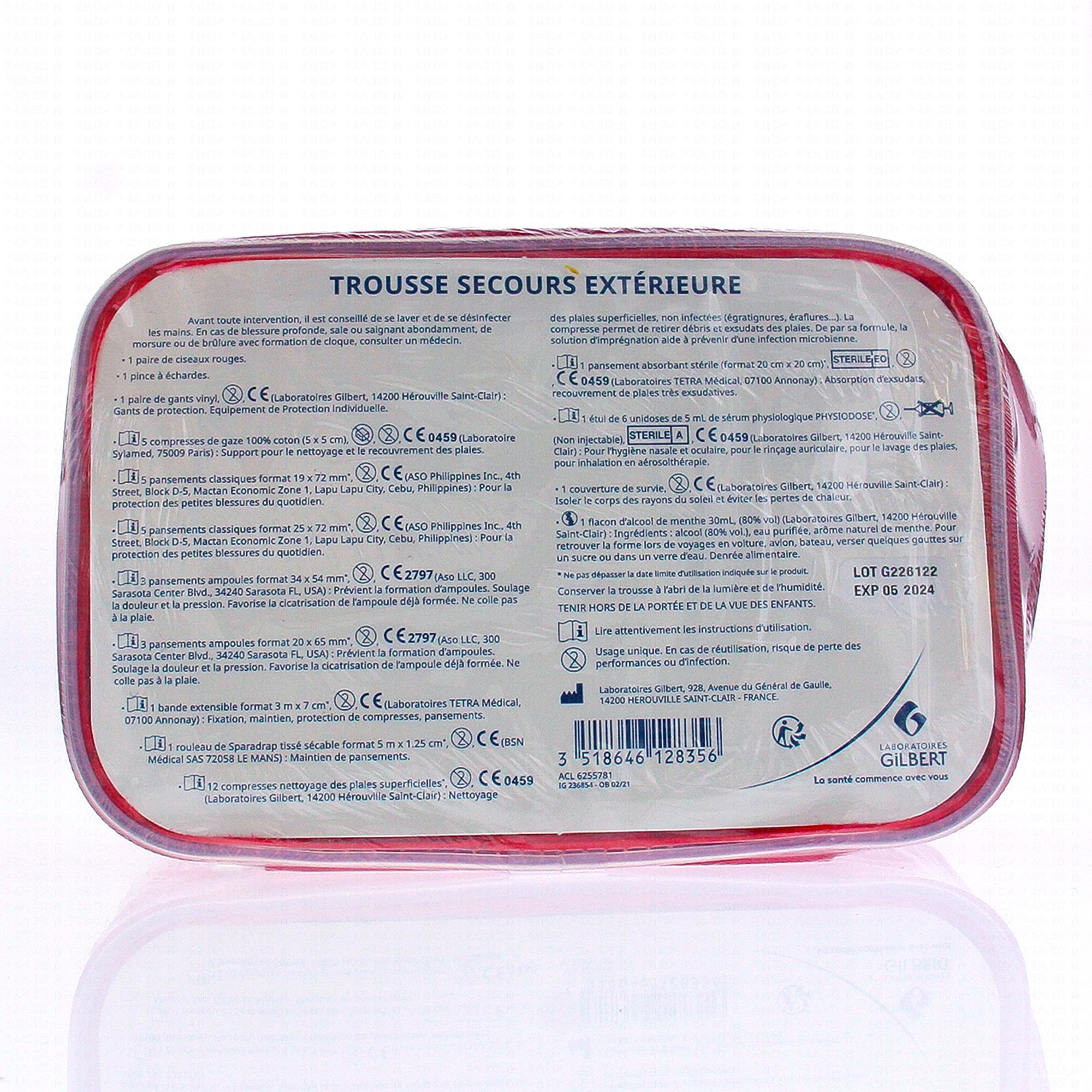 La trousse 1ers secours des laboratoires Gilbert contient :5 compresses de gaze 100% coton.3 pansements classiques format 19x72 mm.3 pansements classiques format 25x72 mm.2 pansements ampoules format 34x54 mm.2 pansements ampoules format 20x65 mm.6 compresses nettoyage de plaies superficielles.5 unidoses de 5mL de sérum physiologique Physiodose.