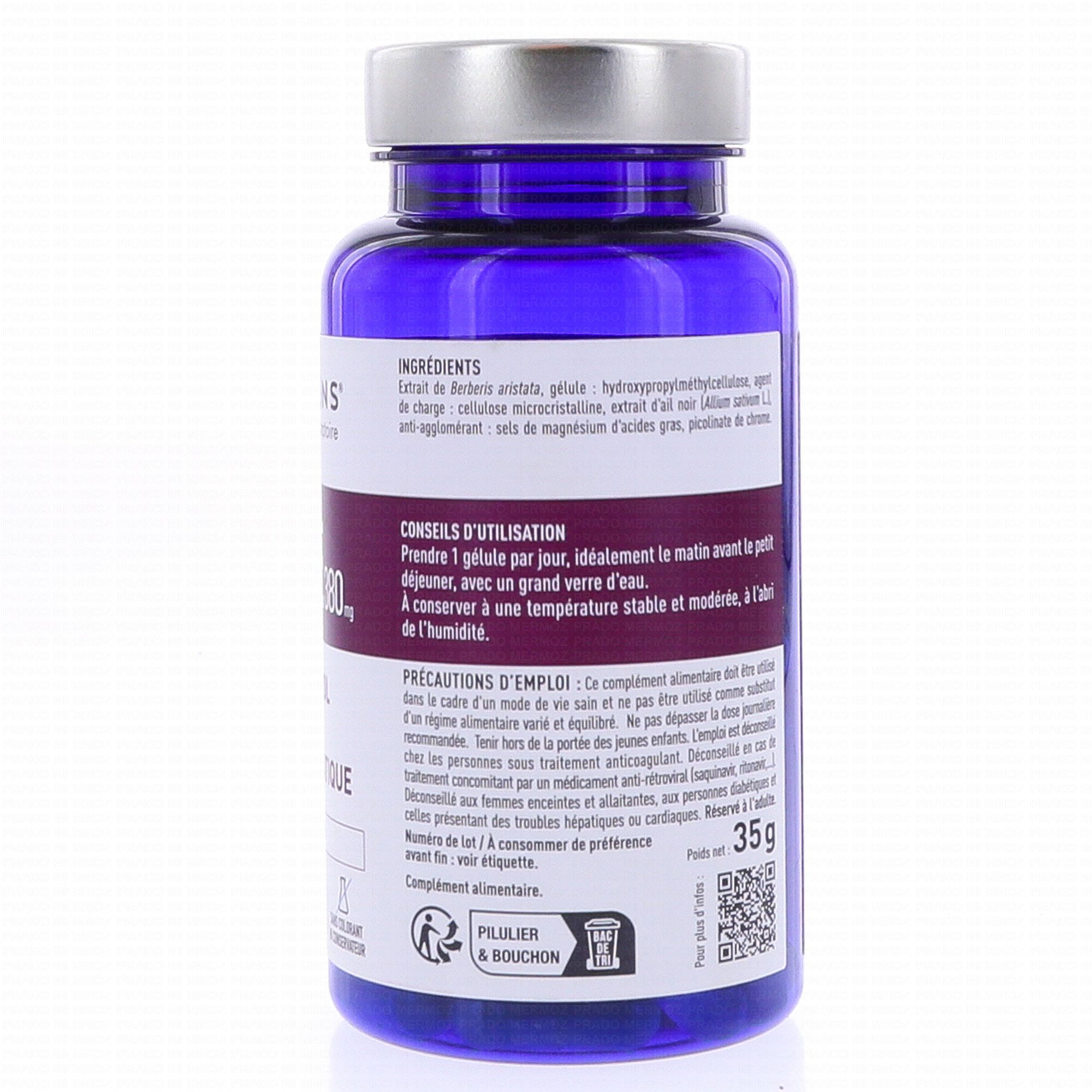 Extrait de Berberis aristata, gélule : hydroxypropylméthylcellulose, agent de charge : cellulose microcristalline, extrait d'ail noir (Allium sativum L.), anti-agglomérant : sels de magnésium d'acides gras, picolinate de chrome.