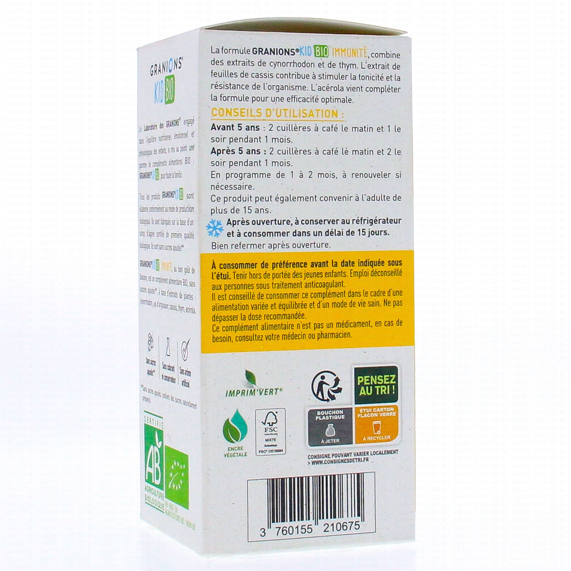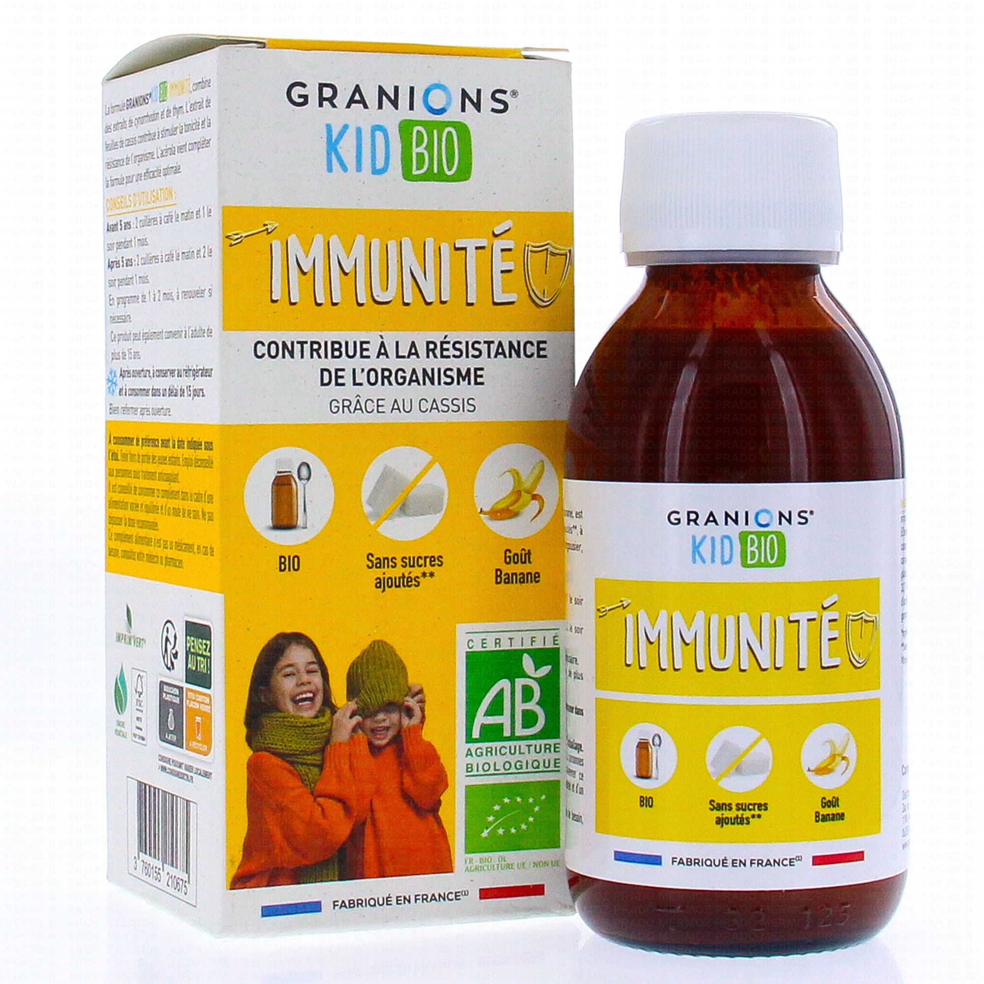 GRANIONS Kid bio immunité saveur banane 125ml est un complément alimentaire qui contribue à renforcer les défenses naturelles du corps grâce à la présence d'Argousier, de Thym et de Rosa Canina.