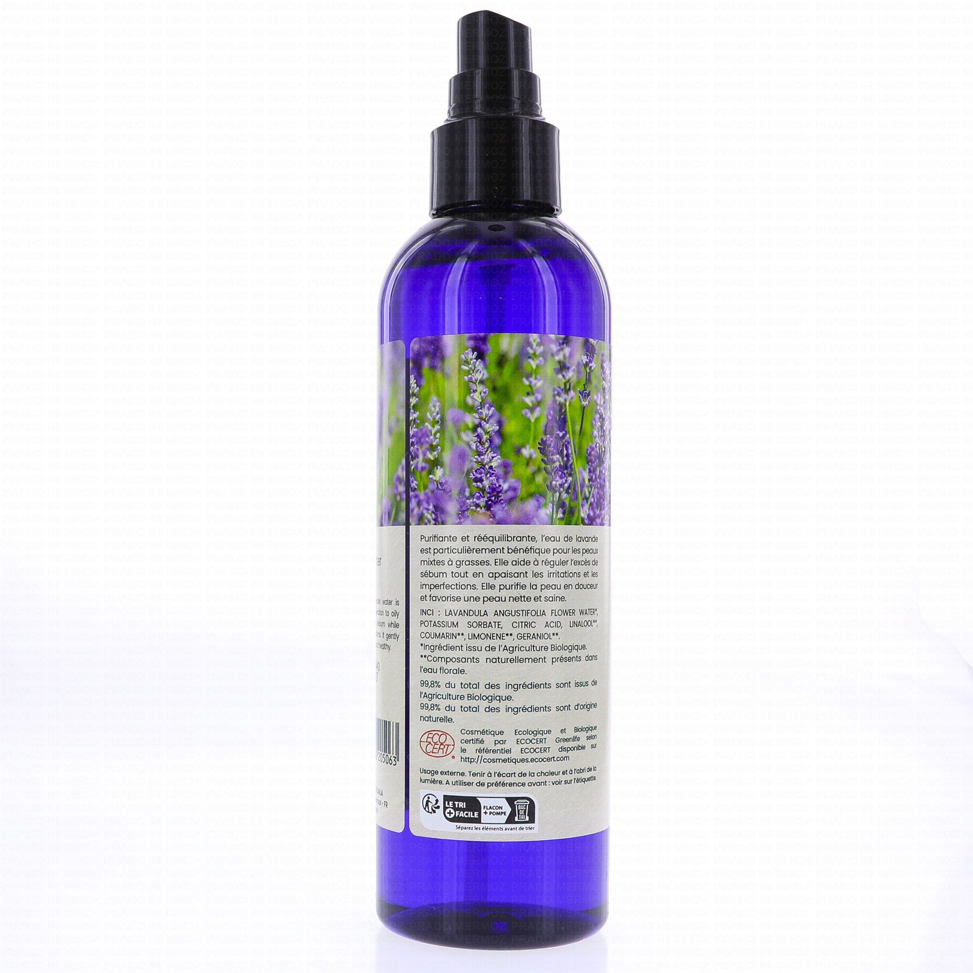 100% hydrolat de lavande biologique* obtenu par distillation de fleurs de lavande fine ( Lavandula Angustifolia flower water*) ; linalol.