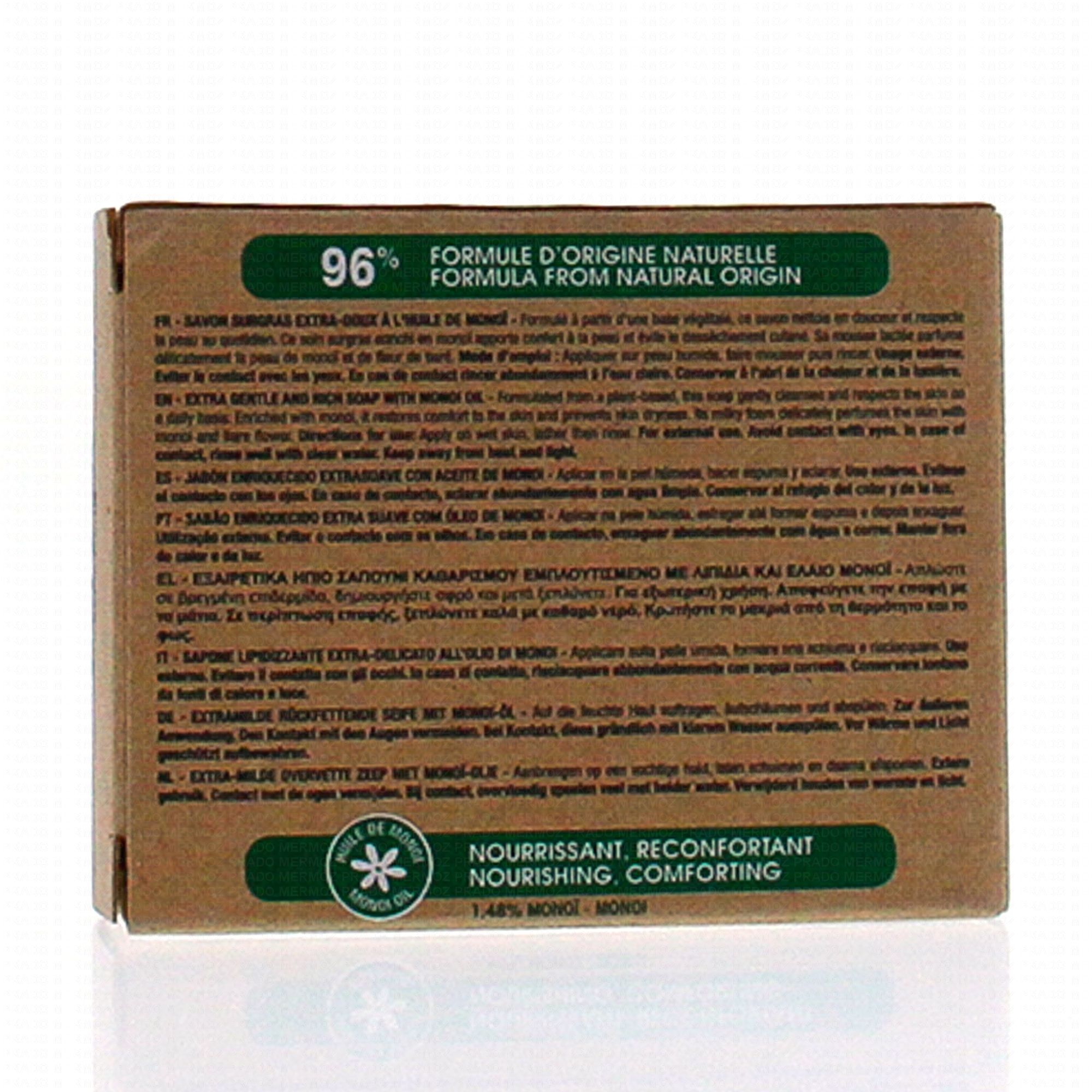 Le savon surgras tiaré d'Hei Poa est un soin d'hygiène quotidienne qui permet d'hydrater et nourrir intensément la peau même sensible.Formulé à base de monoi, il nourrit et répare la peau tout en la nettoyant en douceur. Votre peau est sublimée et imprégnée d'un délicat parfum exotique.