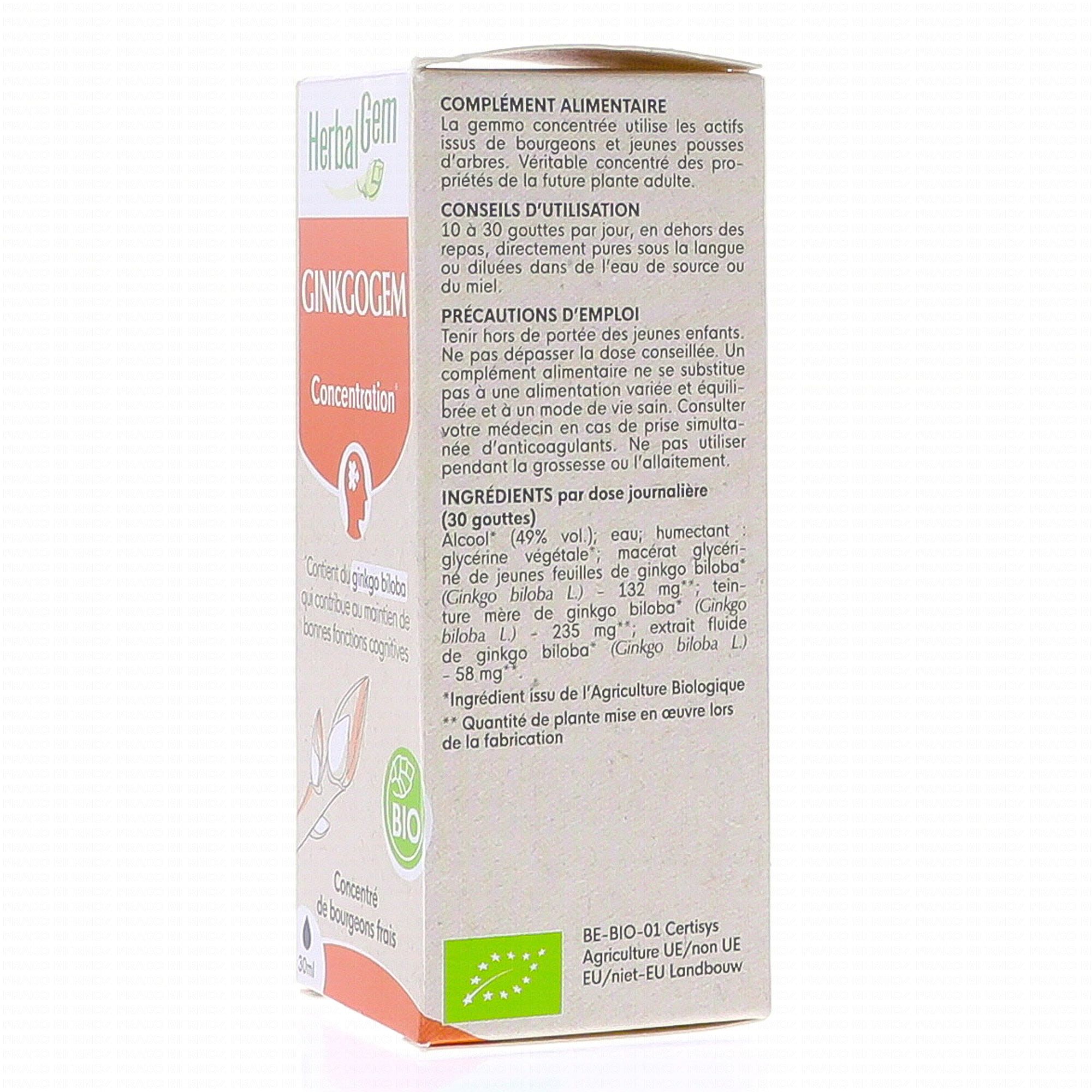 HERBALGEM Concentré de bourgeons frais - Ginkgogem concentration bio 30ml contient les éléments suivants :