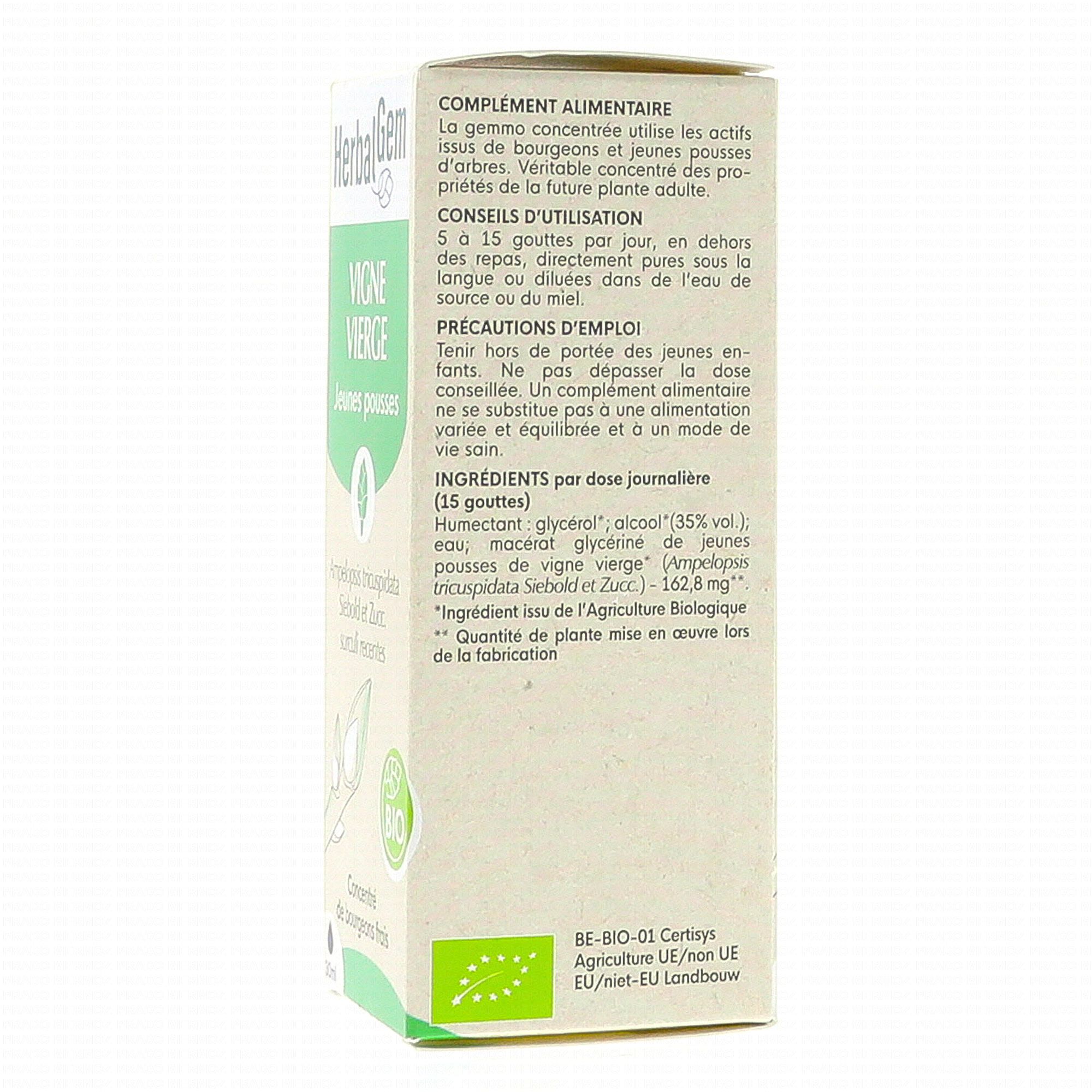 HERBALGEM Concentré de bourgeons frais - Vigne Vierge jeunes pousses bio 30ml contient les éléments suivants :