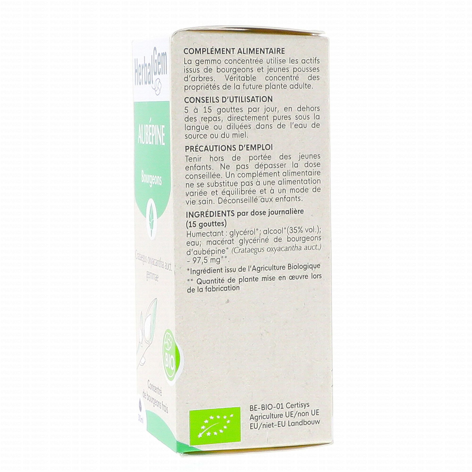 HERBALGEM Concentré du bourgeons frais - Aubépine bourgeons Bio 30ml contient les éléments suivants :