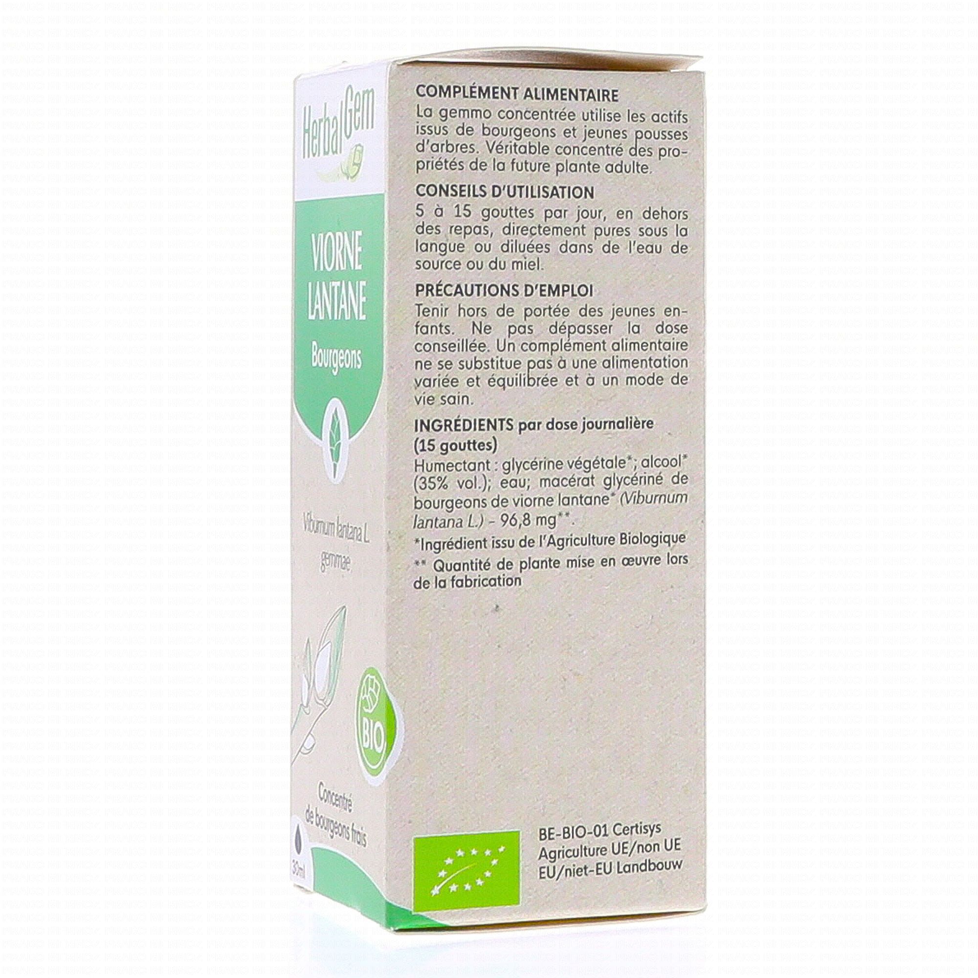 HERBALGEM Concentré du bourgeons frais - Viorne Lantane bourgeons Bio 30ml contient les éléments suivants :