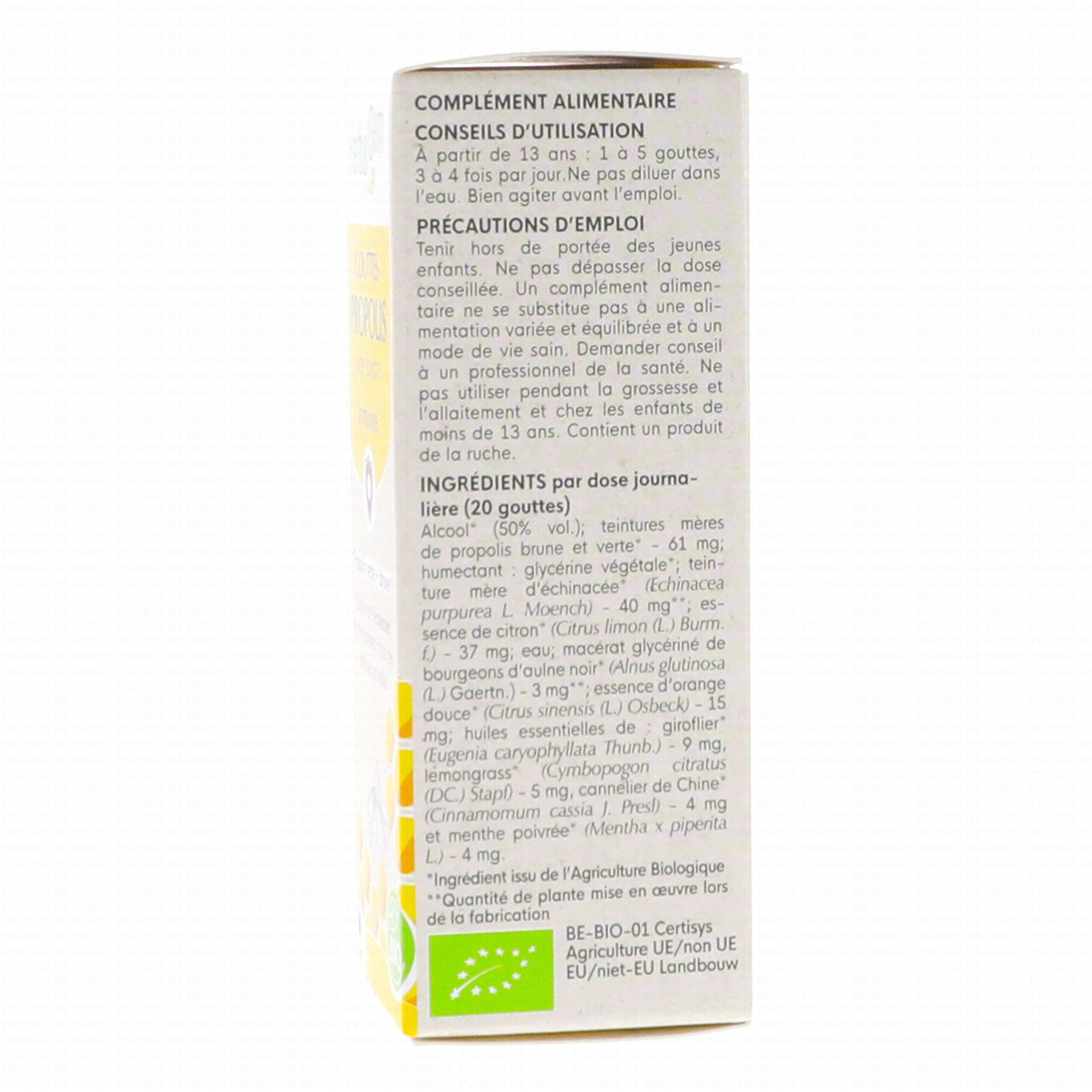 Alcool* (50% vol.) ; teintures mères de propolis brune et verte* - 61 mg ; humectant : glycérine végétale* ; teinture mère d'échinacée* (Echinacea purpurea L. Moench) - 40 mg ; essence de citron* (Citrus x Limon (L.) Osbeck) - 37 mg ; eau ; macérat glycériné de bourgeons d'aulne* (Aulne glutinosa (L.) Gaertn.) - 3 mg ; essence d'orange douce* (Citrus sinensis L. Osbeck) - 15 mg, huiles essentielles de giroflier (eugenia caryophyllata thunb) 9mg, Lemongrass* (Cymbopogon citratus (DC.) Stapf) - 5 mg, cannelier de Chine* (Cinnamomum cassia J. Presl) - 4 mg et menthe poivrée* (Mentha piperita L.) - 4 mg.