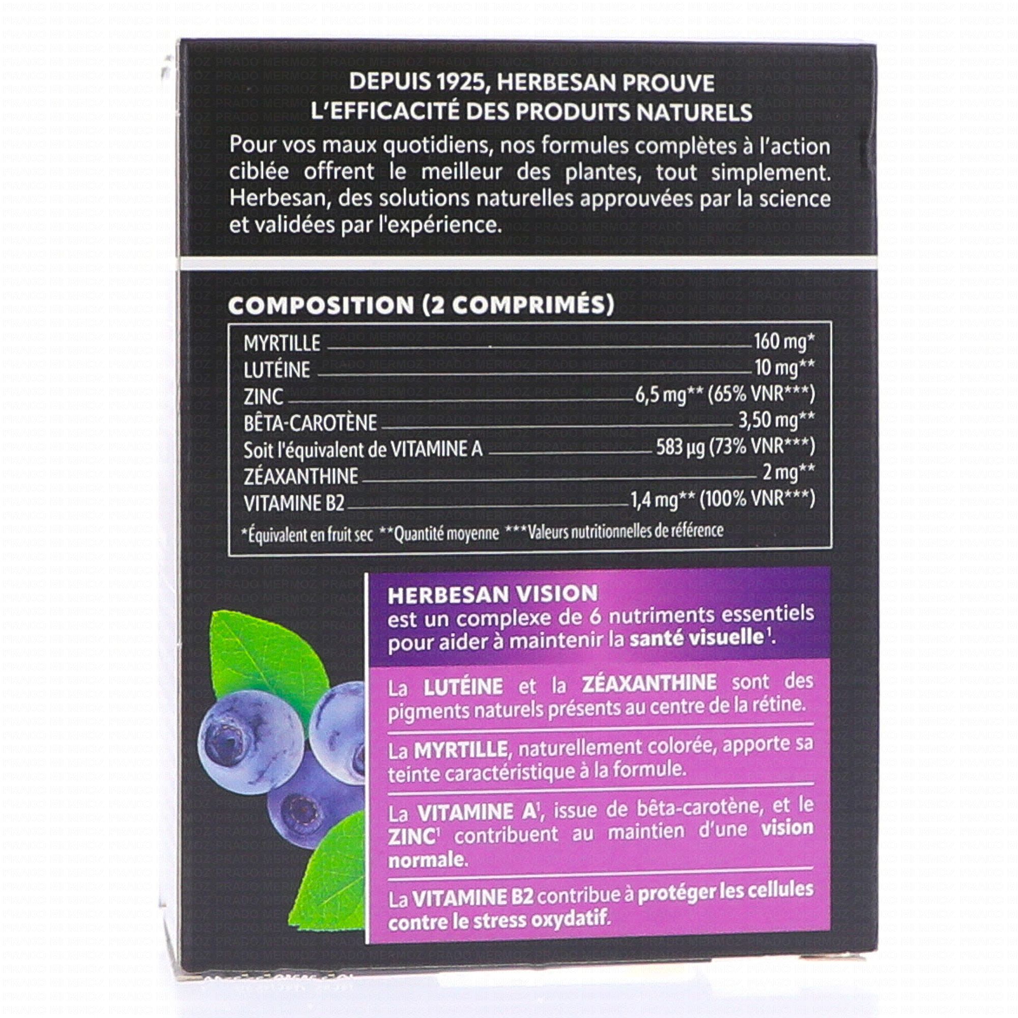 En stockHERBESAN Vision est un complément alimentaire à base de lutéine et zéaxanthine. Il contient également de la myrtille qui aide à maintenir la santé des yeux, ainsi que de la vitamine B2 et du zinc qui contribuent au maintien d'une vision normale et à protéger les cellules contre le stress oxydatif