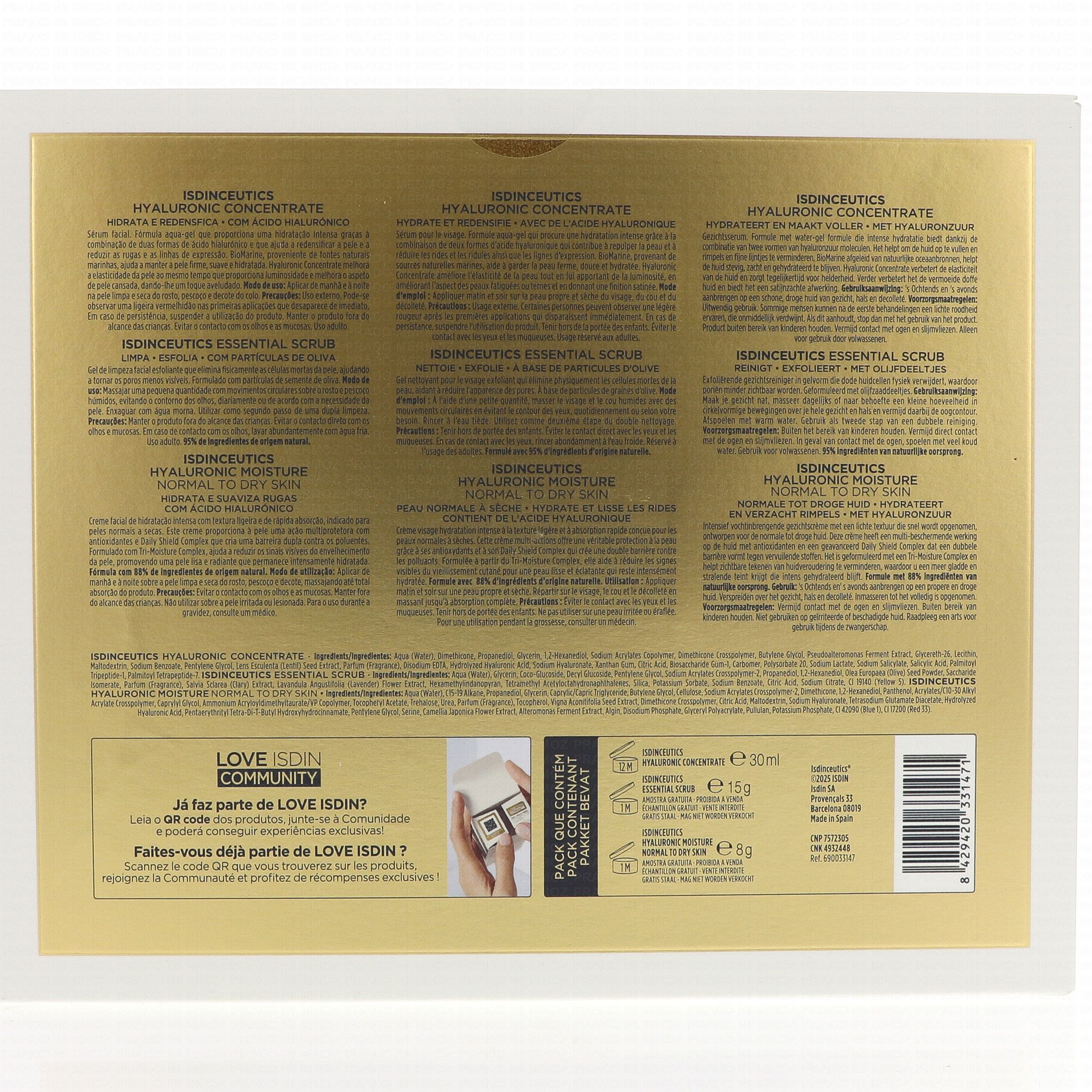 Hyaluronic Essential Scrub 15g: aqua (water), glycerin, coco-glucoside, decyl glucoside, pentylene glycol, sodium acrylates crosspolymer-2, propanediol, 1,2-hexanediol, olea europaea (olive) seed powder, saccharide isomerate, parfum (fragrance), salvia sclarea (clary) extract, lavandula angustifolia (lavender) flower extract, hexamethylindanopyran, tetramethyl acetyl octahydro naphtalenes, silica, potassium sorbate, sodium benzoate, citric acid, sodium citrate, ci 19140 (yellow 5).