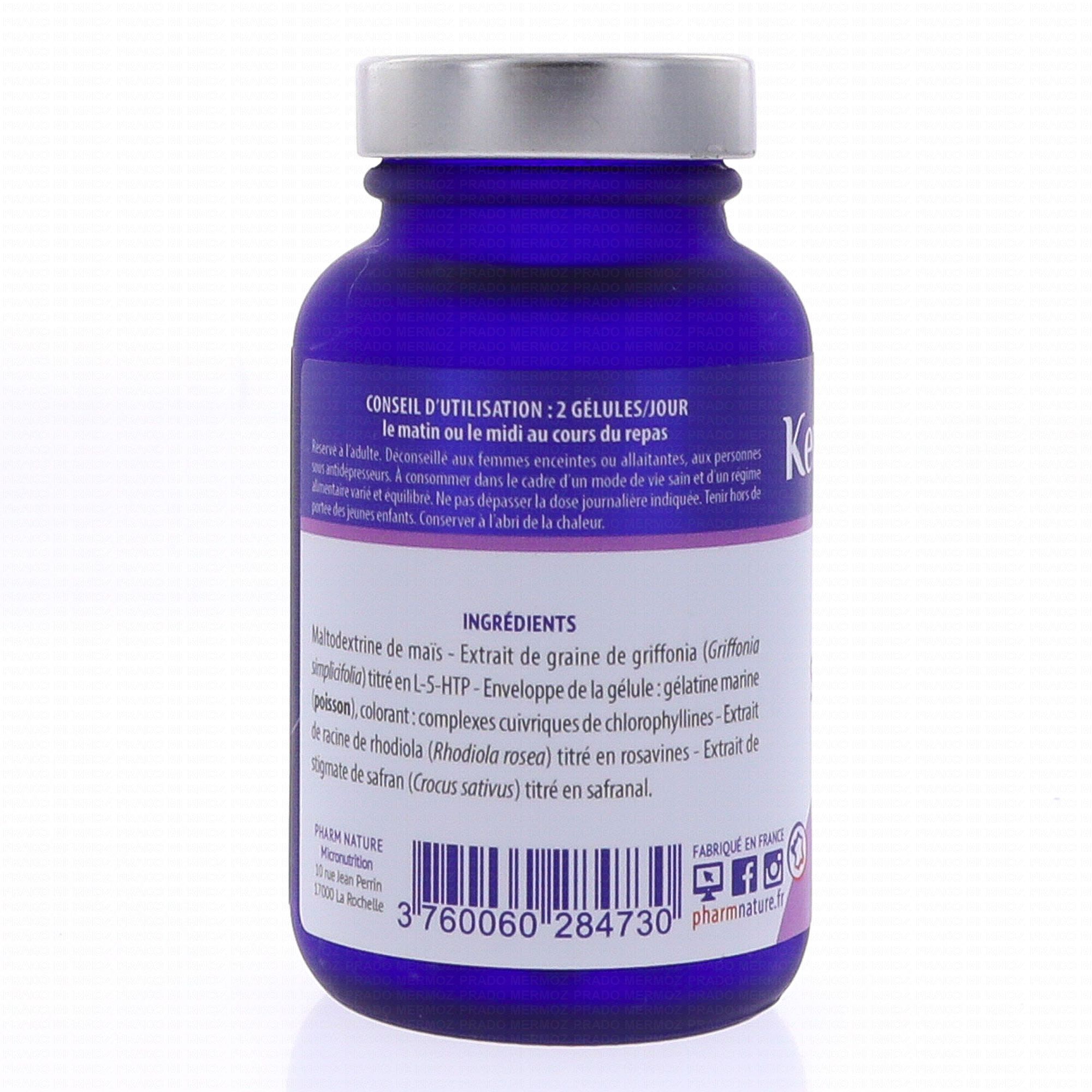 Maltodextrine de maïs, extrait de graines de griffonia (Griffonia simplicifolia) à 30% L-5-HTP, extrait de rhizomes de rhodiola (Rhodiola rosea) à 3% salidrosides, extrait de stigmates de safran (Crocus sativus) à 2% safranal. Tunique : gélatine marine.