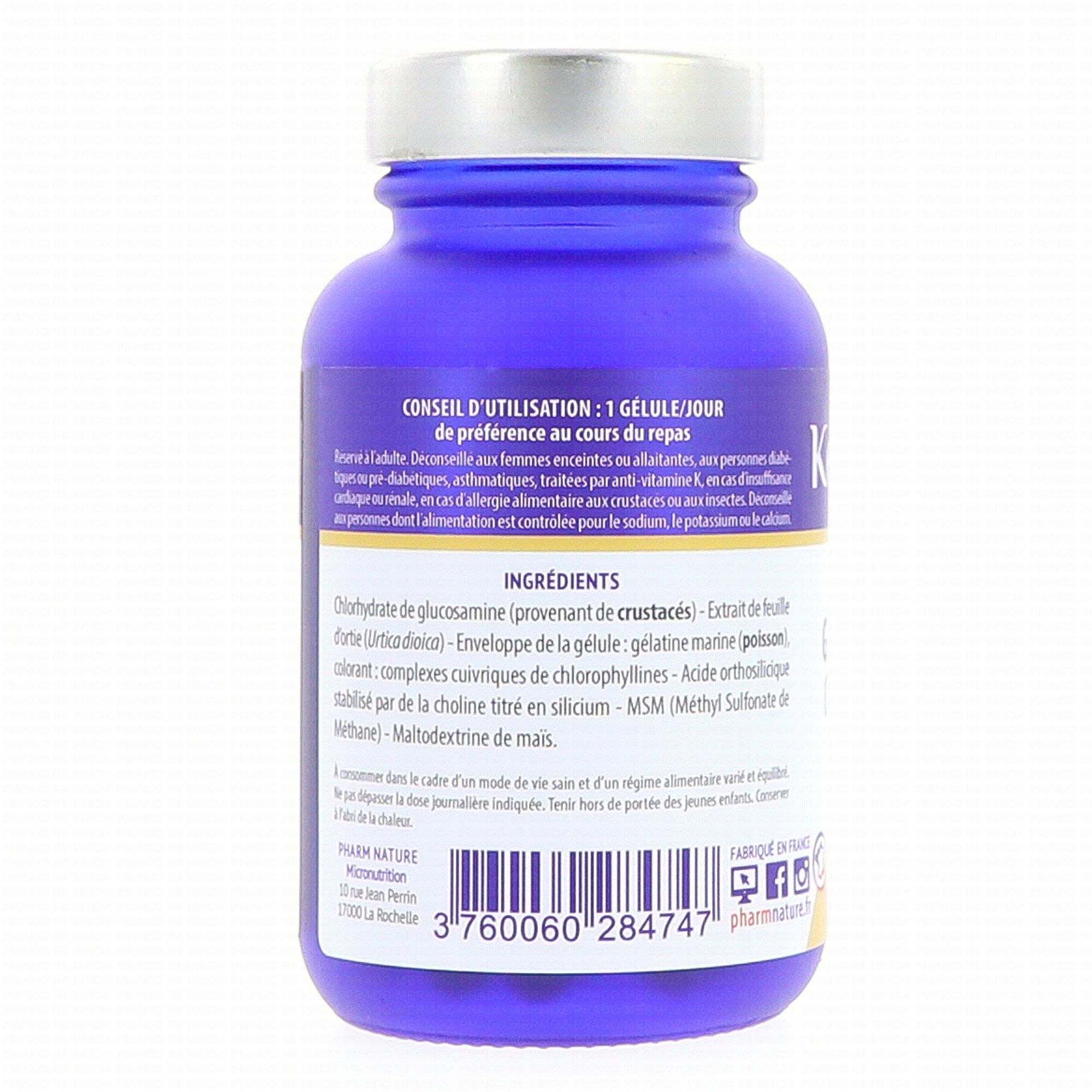Chlorhydrate de glucosamine (provenant de crustacés) – Extrait de feuille d'ortie (Urtica dioica) – Enveloppe de la gélule : gélatine marine (poisson), colorant : complexes cuivriques de chlorophyllines – Acide orthosilicique stabilisé par de la choline titré en silicium – MSM (Méthyl Sulfonate de Méthane) – Maltodextrine de maïs.