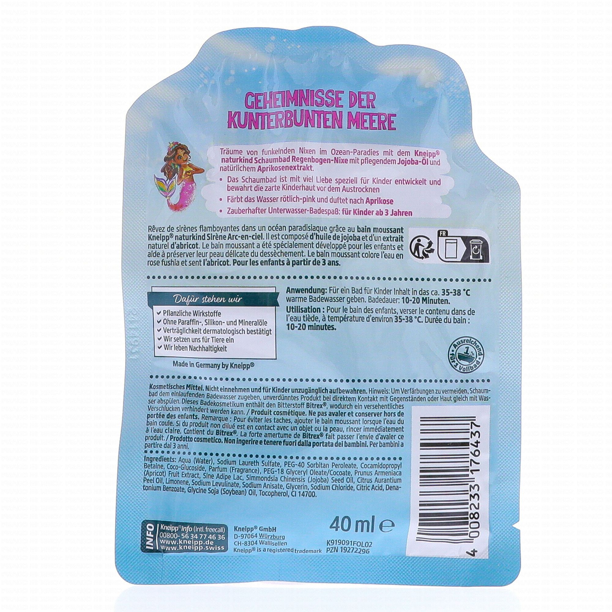 Rêvez de sirènes flamboyantes dans un océan paradisiaque grâce au bain moussant Kneipp naturkind (enfants de nature) Sirène Arc-en-ciel. Il est composé d'huile de jojoba et d'un extrait naturel d'abricot. Le bain moussant a été spécialement développé pour les enfants à partir de 3 ans et aide à préserver leur peau délicate du dessèchement.