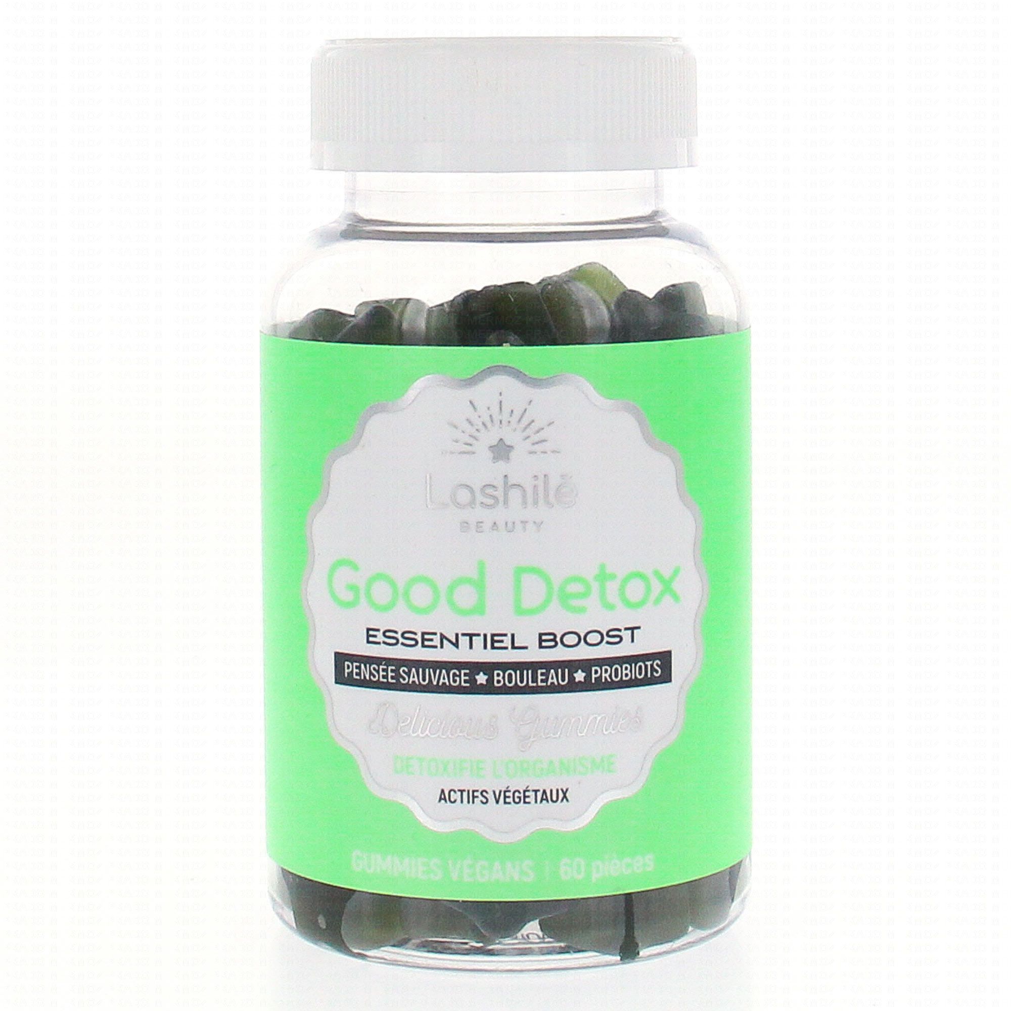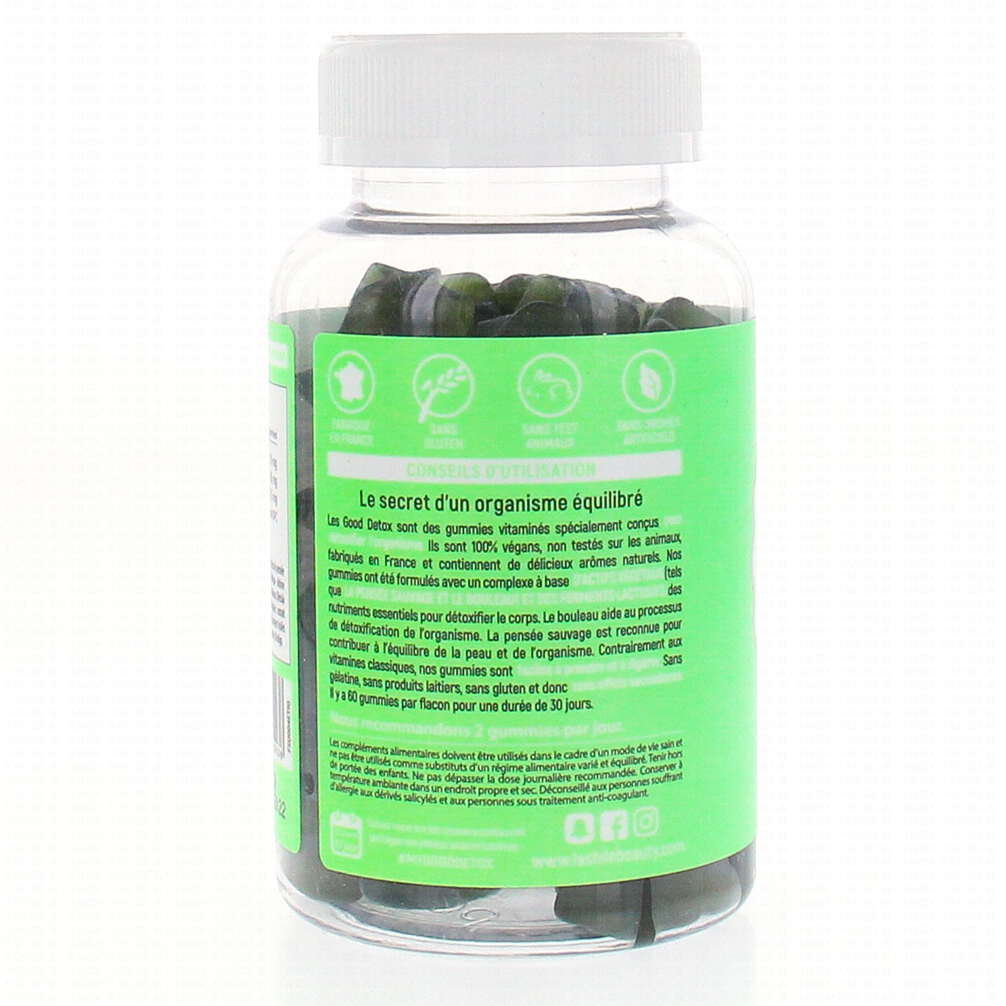 LASHILE BEAUTY Good Detox 60 gummies ont été formulés avec un complexe à base d'actifs végétaux tels que la pensée sauvage, le bouleau et des ferments lactiques.
