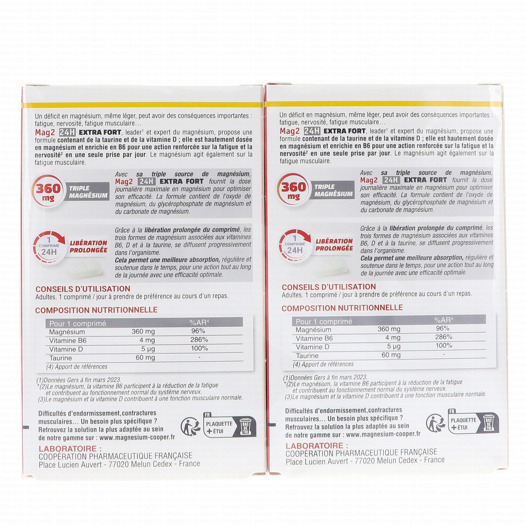 MAG 2 Extra-Fort 24h est un complément alimentaire qui contribue au fonctionnement normal du système nerveux grâce à la présence de magnésium. Celui ci aide également, en association avec la vitamine D, au fonctionnement normal du musculaire.