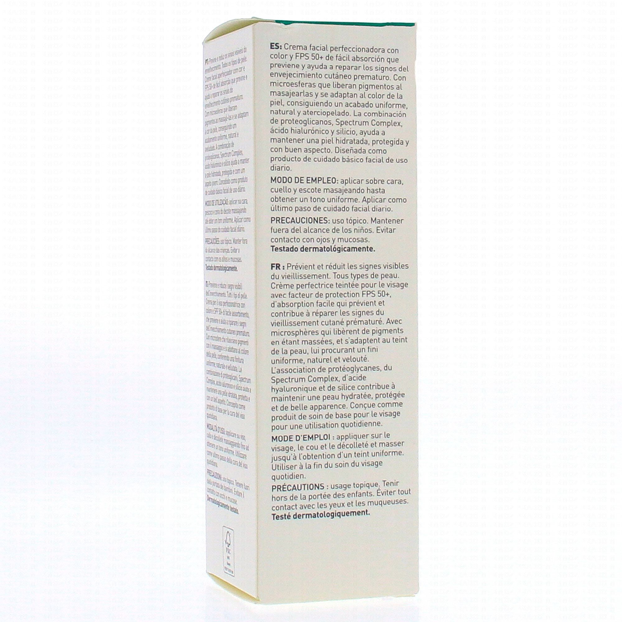 D'absorption facile, elle prévient et contribue à réparer les signes du vieillissement cutané prématuré. La couleur apparaît lorsque l'émulsion est appliquée sur la peau en effectuant un léger massage, et celle-ci libère ainsi une teinte naturelle qui s'adapte à tous les types de peau, et améliore son apparence. Sa texture Cream-to-Powder confère à la peau une sensation soyeuse et invisible. Elle procure également une protection à large spectre contre les rayons UVA / UVB / IR / HEV (lumière bleue). L'association de protéoglycanes, du Spectrum Complex et du complexe d'acide hyaluronique et de silicium contribue à maintenir un teint jeune, frais et uniforme.
