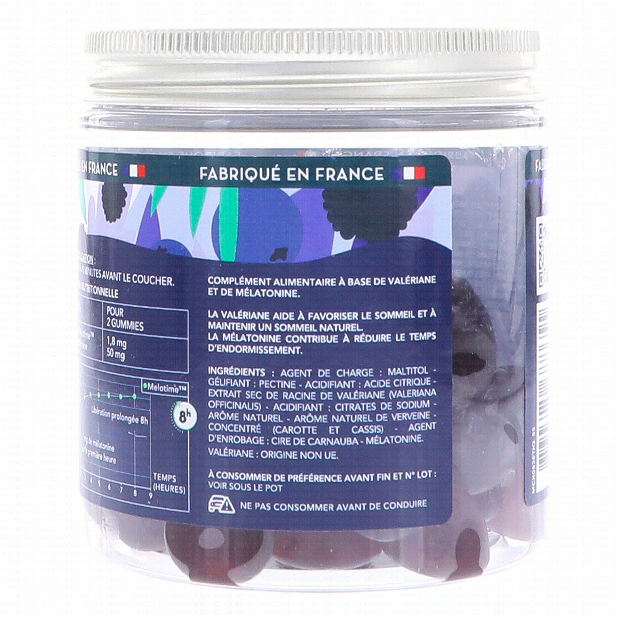 Agent de charge : maltitol - gélifiant : pectine - acidifiant : acide citrique - extrait sec de racine de valériane (Valeriana officinalis) - acidifiant : citrates de sodium - arôme naturel - arôme naturel de verveine - concentré (carotte et cassis) - agent d'enrobage : cire de carnauba - mélatonine