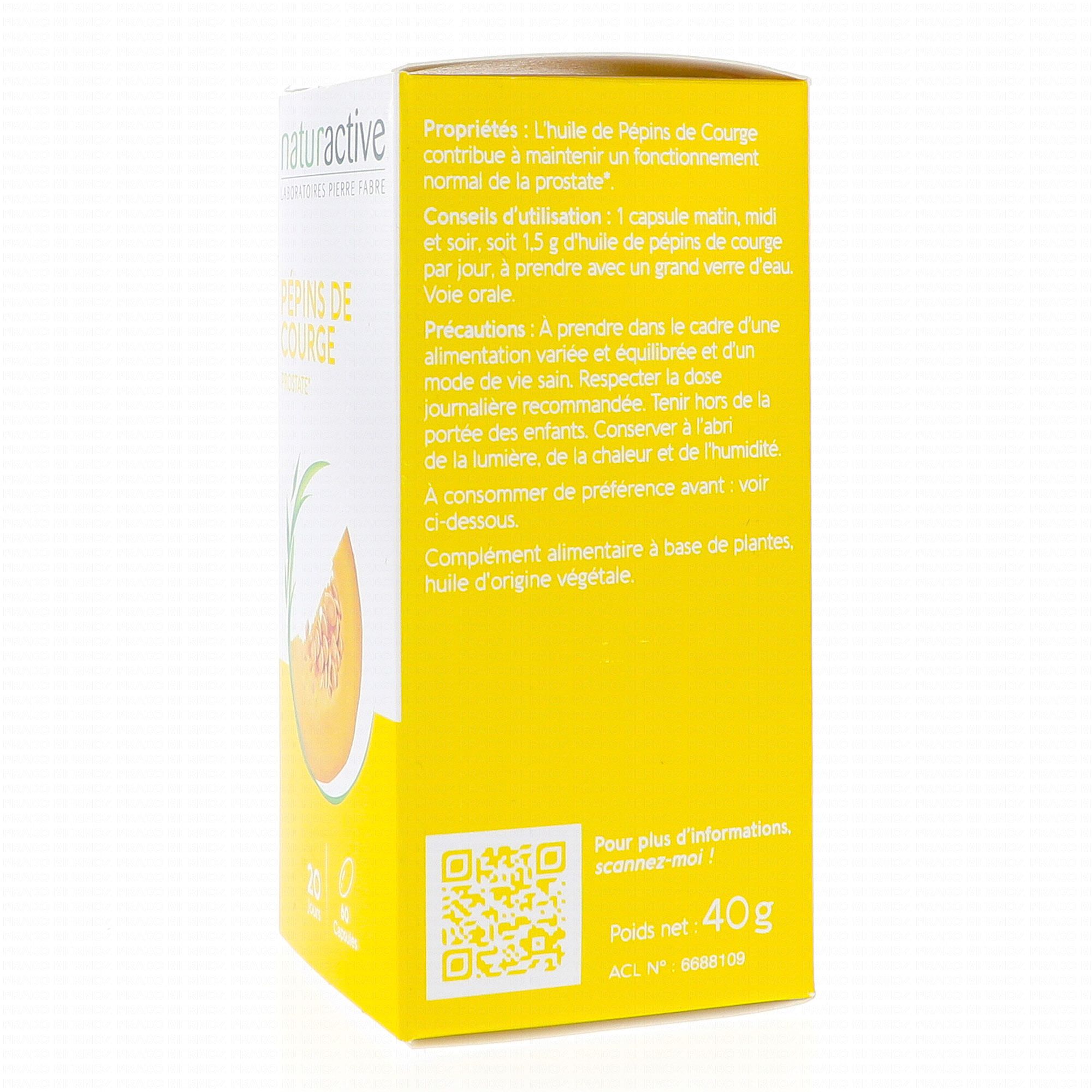 NATURACTIVE Pépins de courge 60 gélules est un complément alimentaire qui contribue confort urinaire chez l'homme grâce à la présence de Pépins de courge.