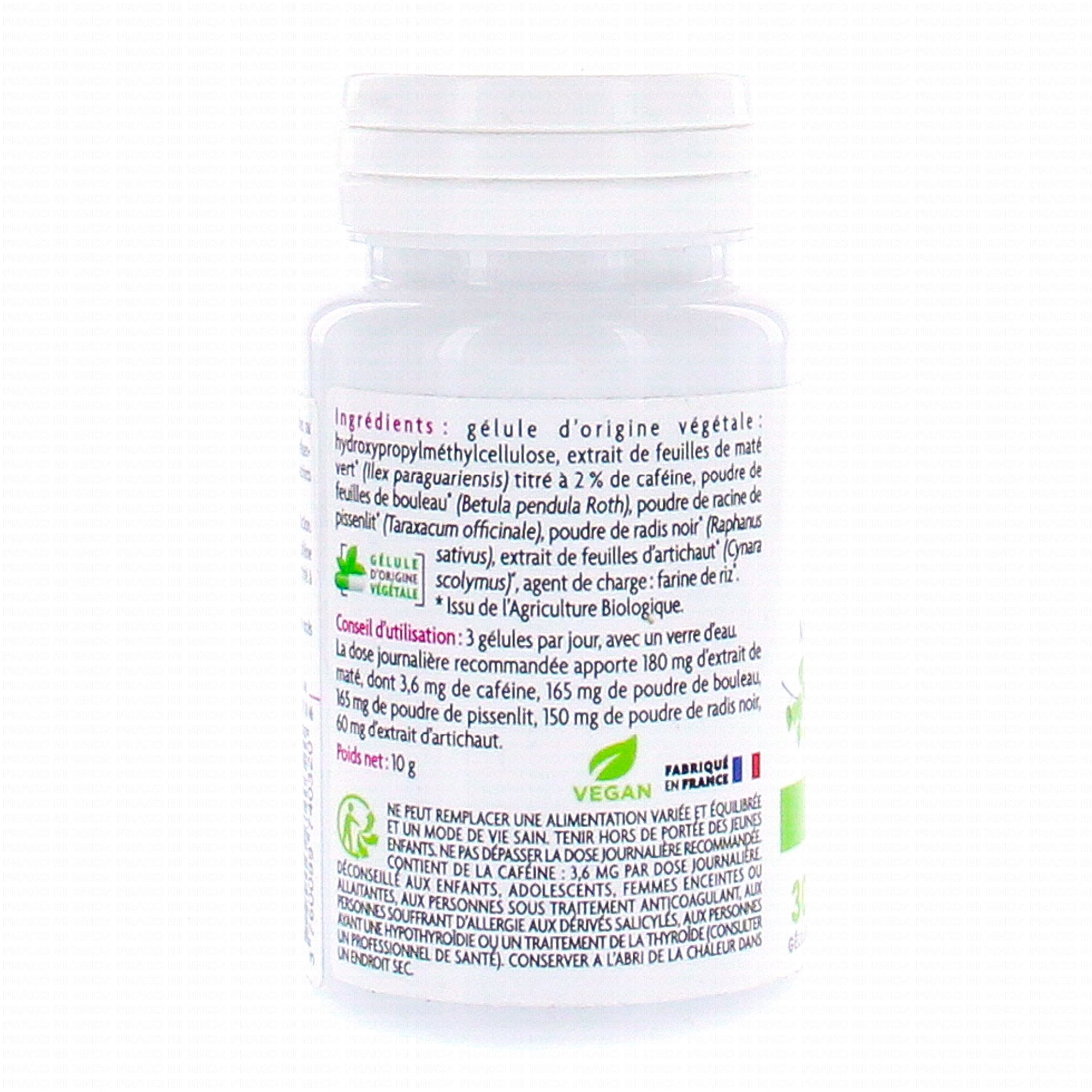 Gélule d'origine végétale : hydroxypropylméthylcellulose ; extrait de feuilles de maté vert* (Ilex paraguariensis) titré à 2% de caféine ; poudre de feuilles de bouleau* (Betula pendula Roth) ; poudre de racine de pissenlit* (Taraxacum officinale) ; poudre de radis noir* (Raphanus sativus) ; extrait de feuilles d'artichaut* (Cynara scolymus) ; agent de charge : farine de riz*. * Issu de l'Agriculture Biologique