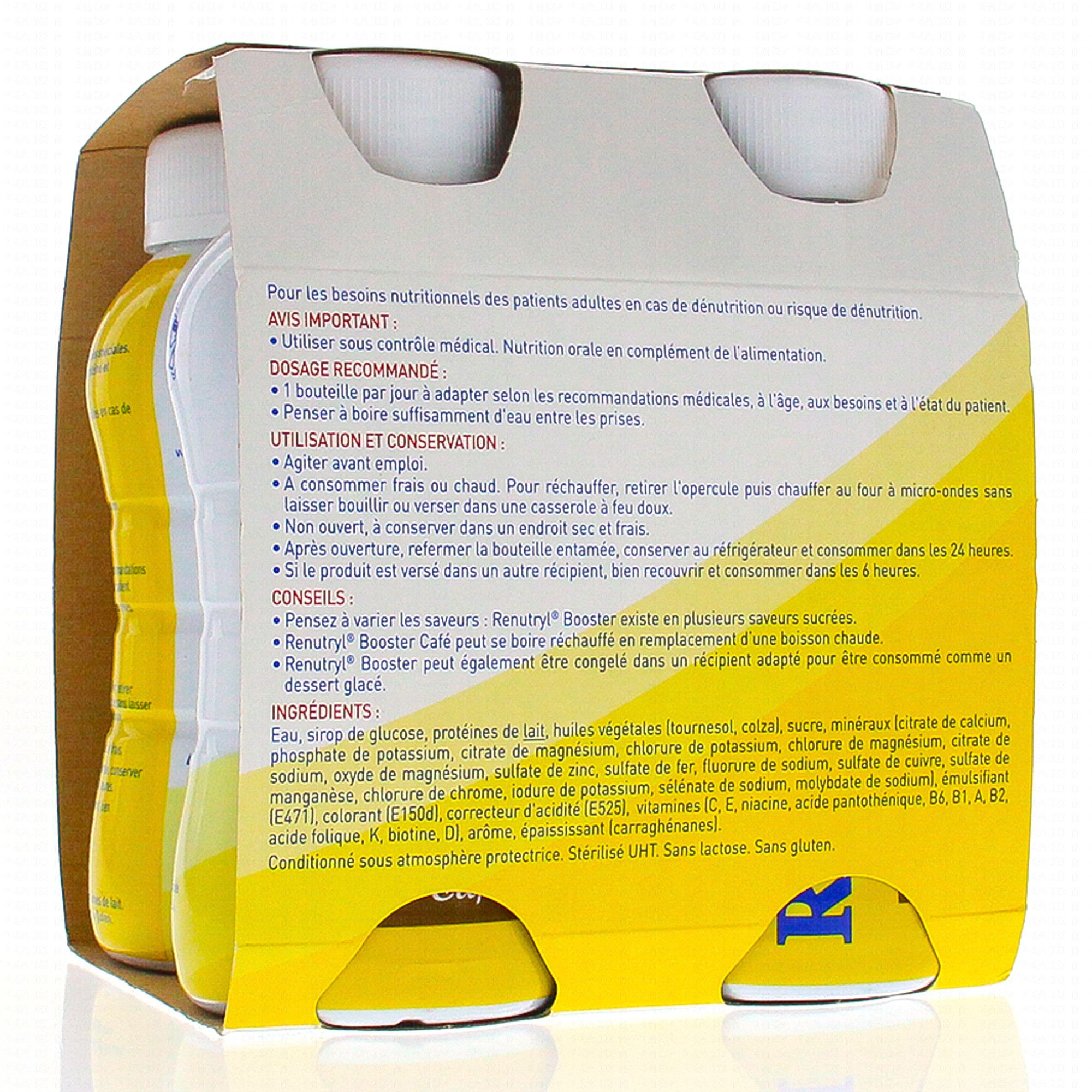 NESTLE Renutryl Booster saveur café 4x300ml est une boisson hyperprotéinée et hypercalorique destinée aux personnes souffrants de dénutrition ou en voie de dénutrition. Chaque bouteille apporte 600kcal et 30 grammes de protéines.