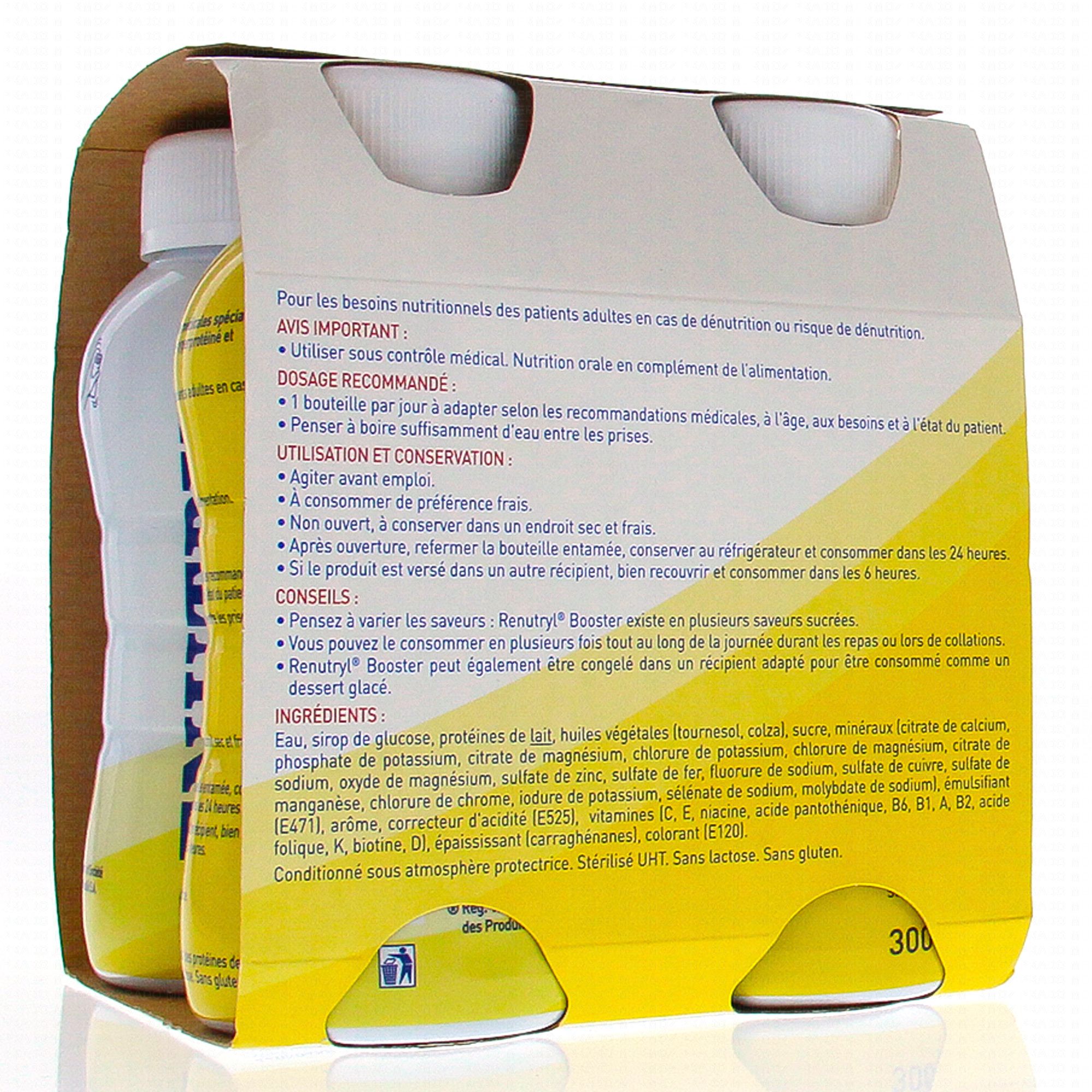 Après ouverture, refermer la bouteille entamée, conserver Renutryl Booster au réfrigérateur et consommer dans les 24 heures maximum. Si le produit est versé dans un autre récipient, bien recouvrir et consommer dans les 6 heures.