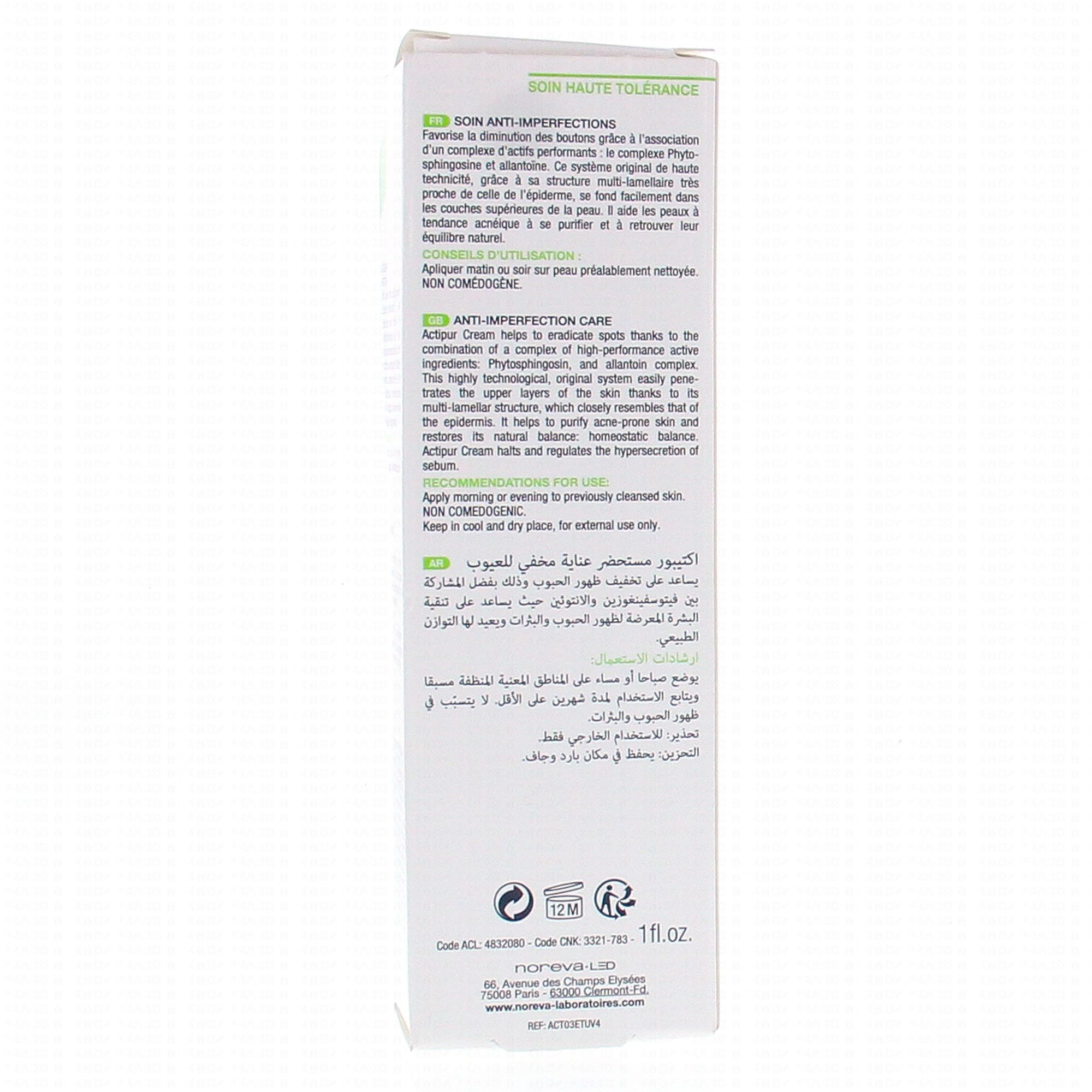 Recommandée en soin pour les peaux mixtes à grasses à tendance acnéique, la crème matifiante Actipur élimine les imperfections cutanées chez la femme. Structure multilamellaire, soin équilibrant, purifiant, matifiant et séborégulateur. Texture fluide et légère. Non comédogène. Conditionnement : tube plastique, étui carton.