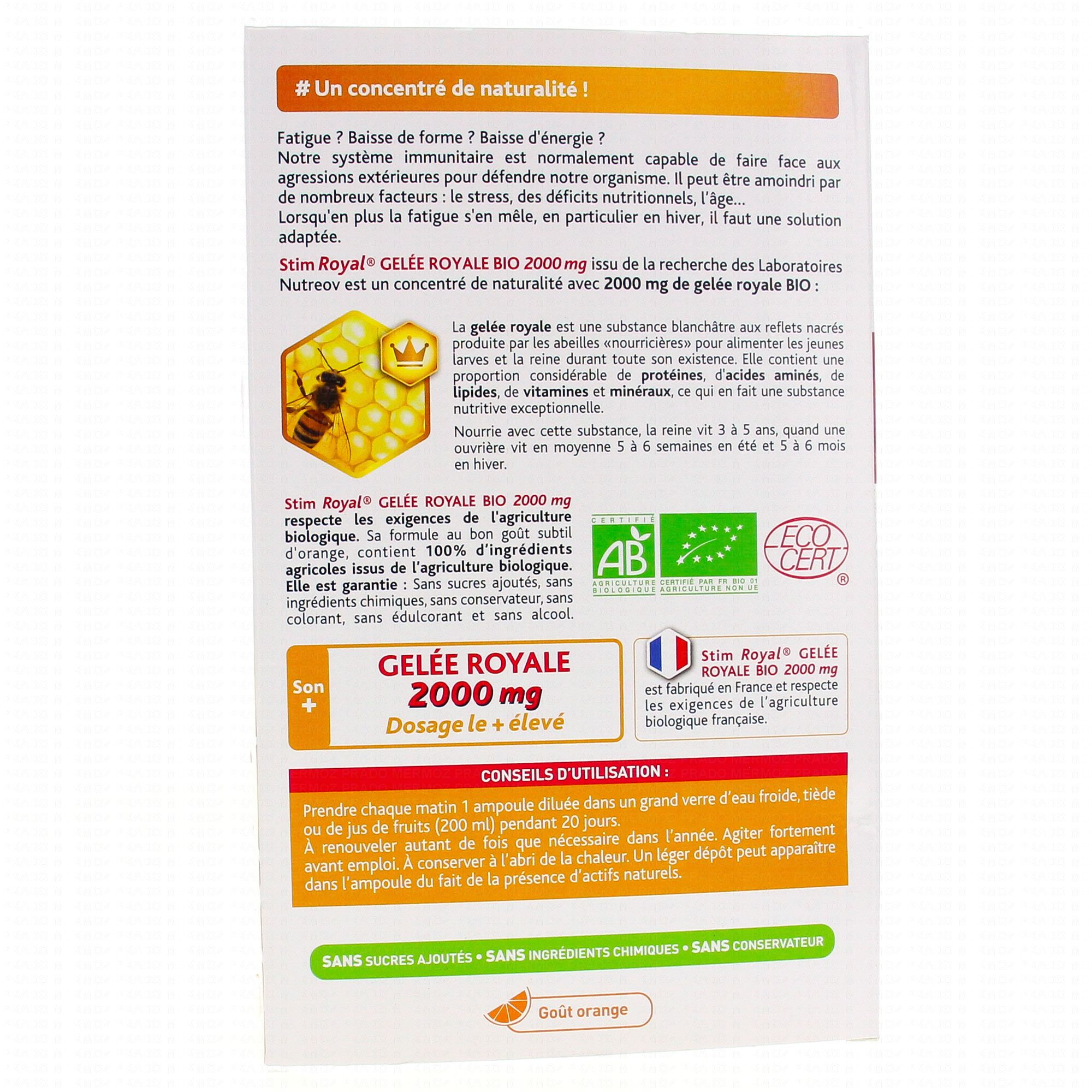 NUTREOV Stim Royal Gelée Royale 2000mg Bio 20 ampoules contient les éléments suivants :