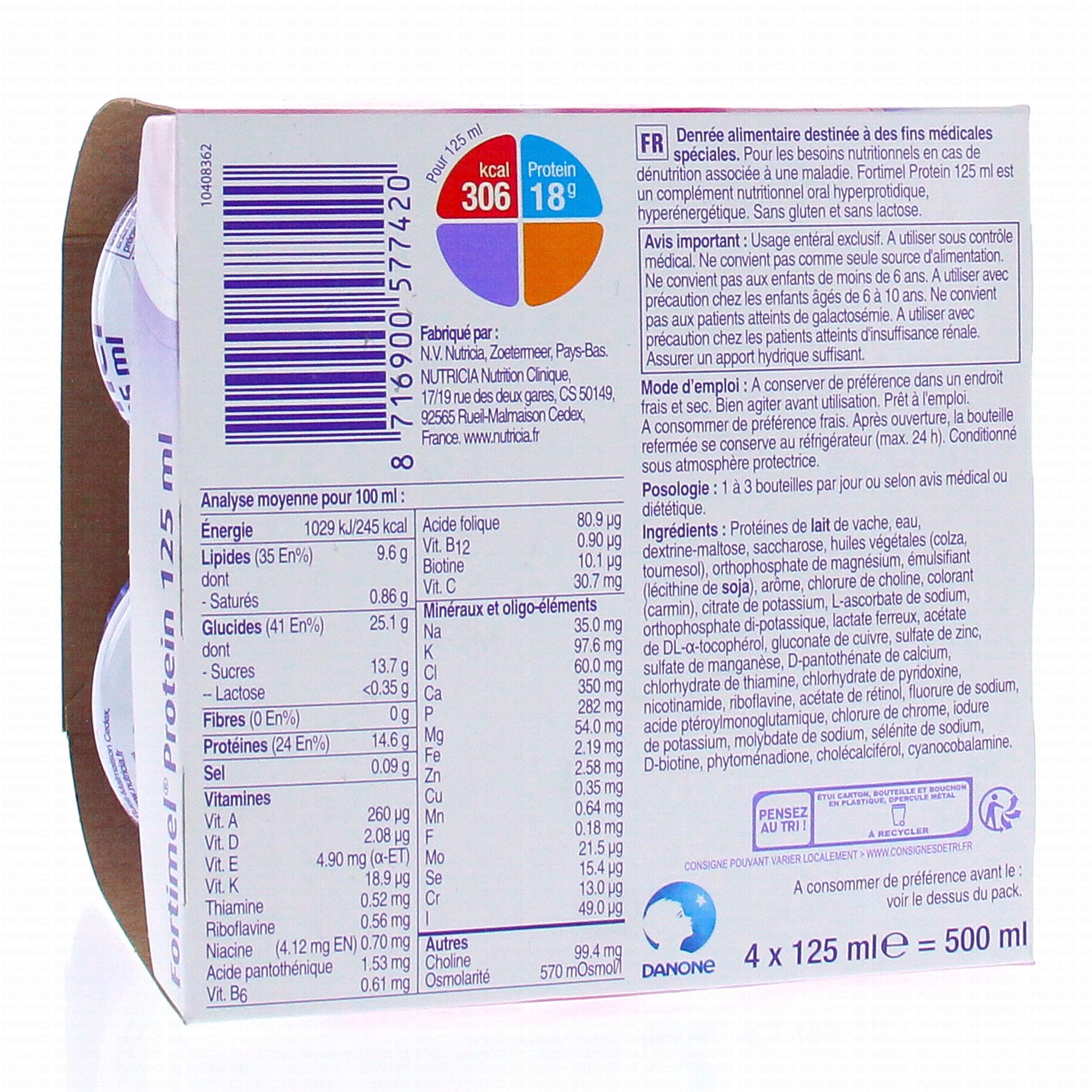 NUTRICIA Fortimel Protein saveur fraise 4x200ml est un complément alimentaire qui vous apporte 480 calories et 29g de protéines.