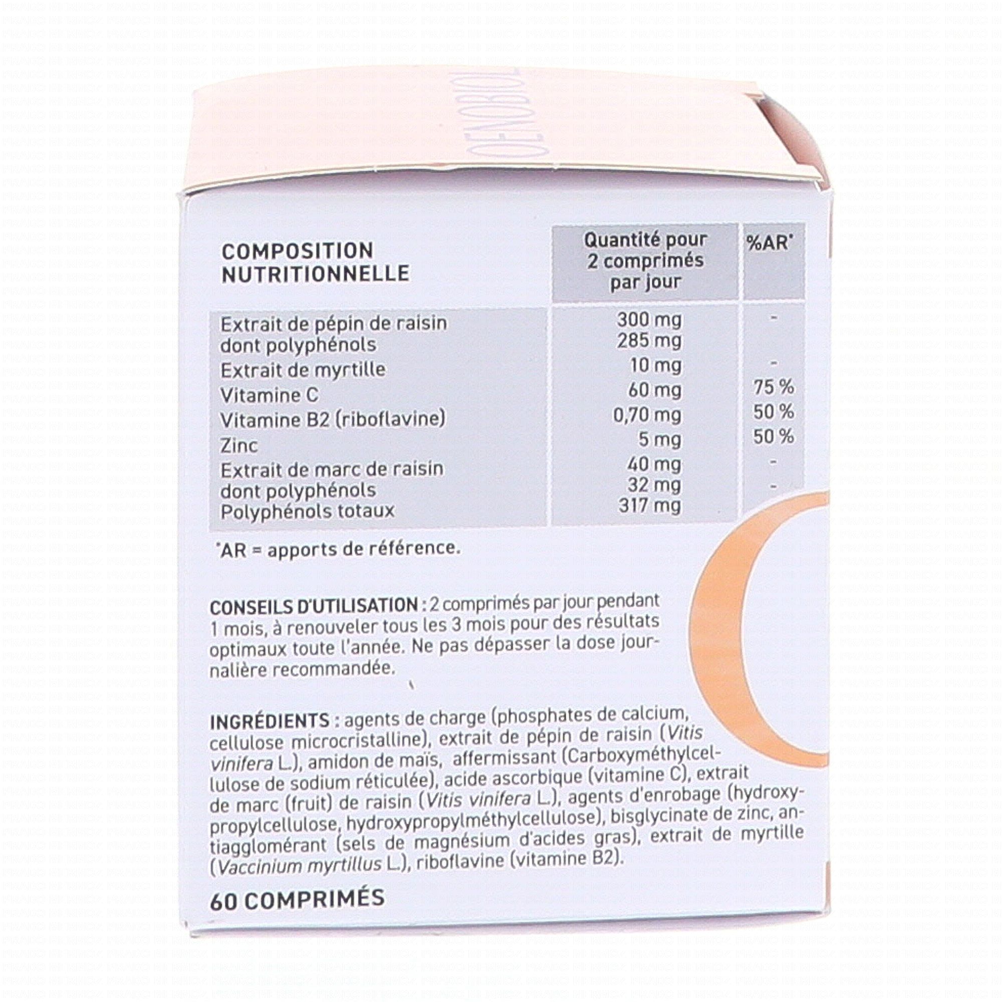 Pour 2 comprimés par jour :Extrait de pépin de raisin 300mg,