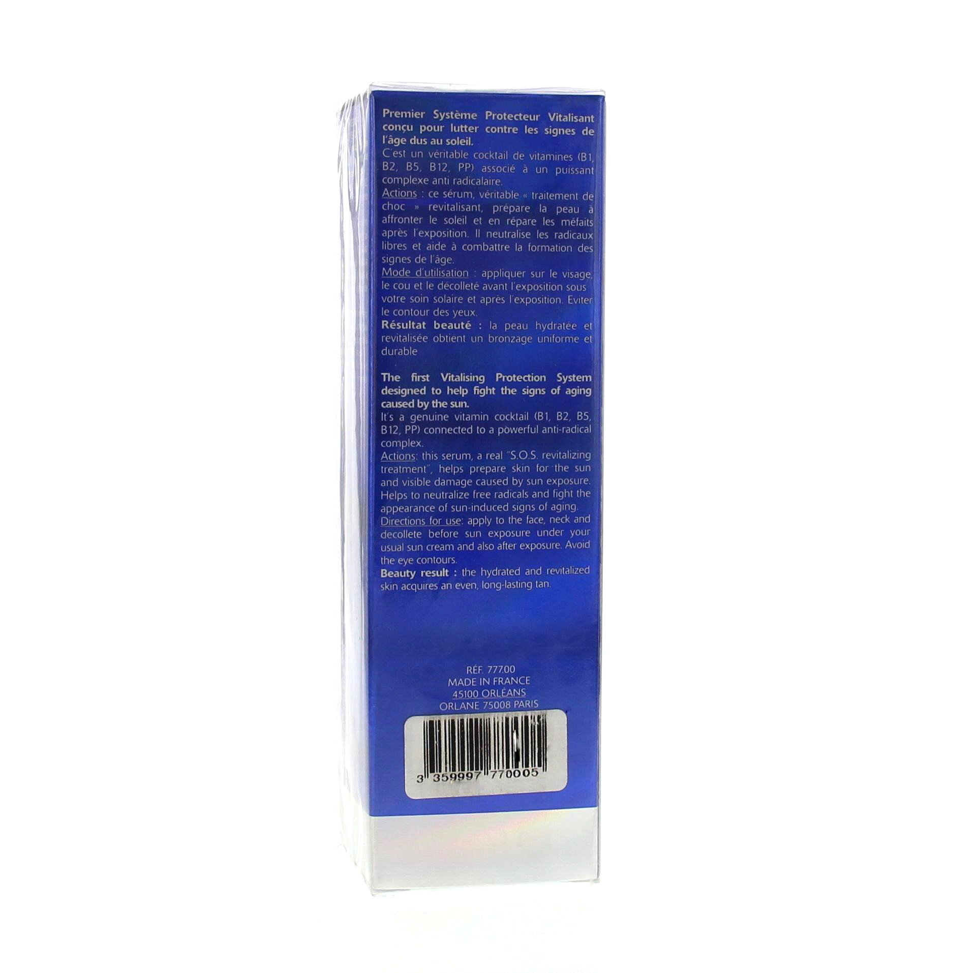 Ce sérum est le premier système protecteur vitalisant conçu pour lutter contre les signes de l'âge dus au soleil, véritable "traitement de choc" revitalisant, il prépare la peau à affronter le soleil et en répare les méfaits après l'exposition et neutralise les radicaux libres. Ainsi la peau hydratée et revitalisée obtient un bronzage uniforme et durable.