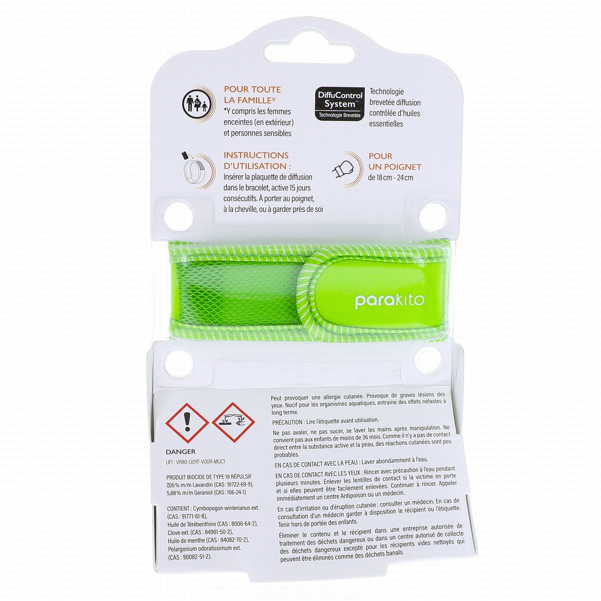 Les bracelets anti moustiques rechargeables PARAKITO assurent une diffusion contrôlée d'huiles essentielles et de g&raniol qui protègent des moustiques. Une plaquette vous assure jusqu'à 15 jours d'efficacité, il faut donc la changer dans le bracelet tous les 15 jours. Adaptés aux enfants de plus de 3 ans, et résistants à l'eau ils peuvent être utilisés durant toutes les activités.