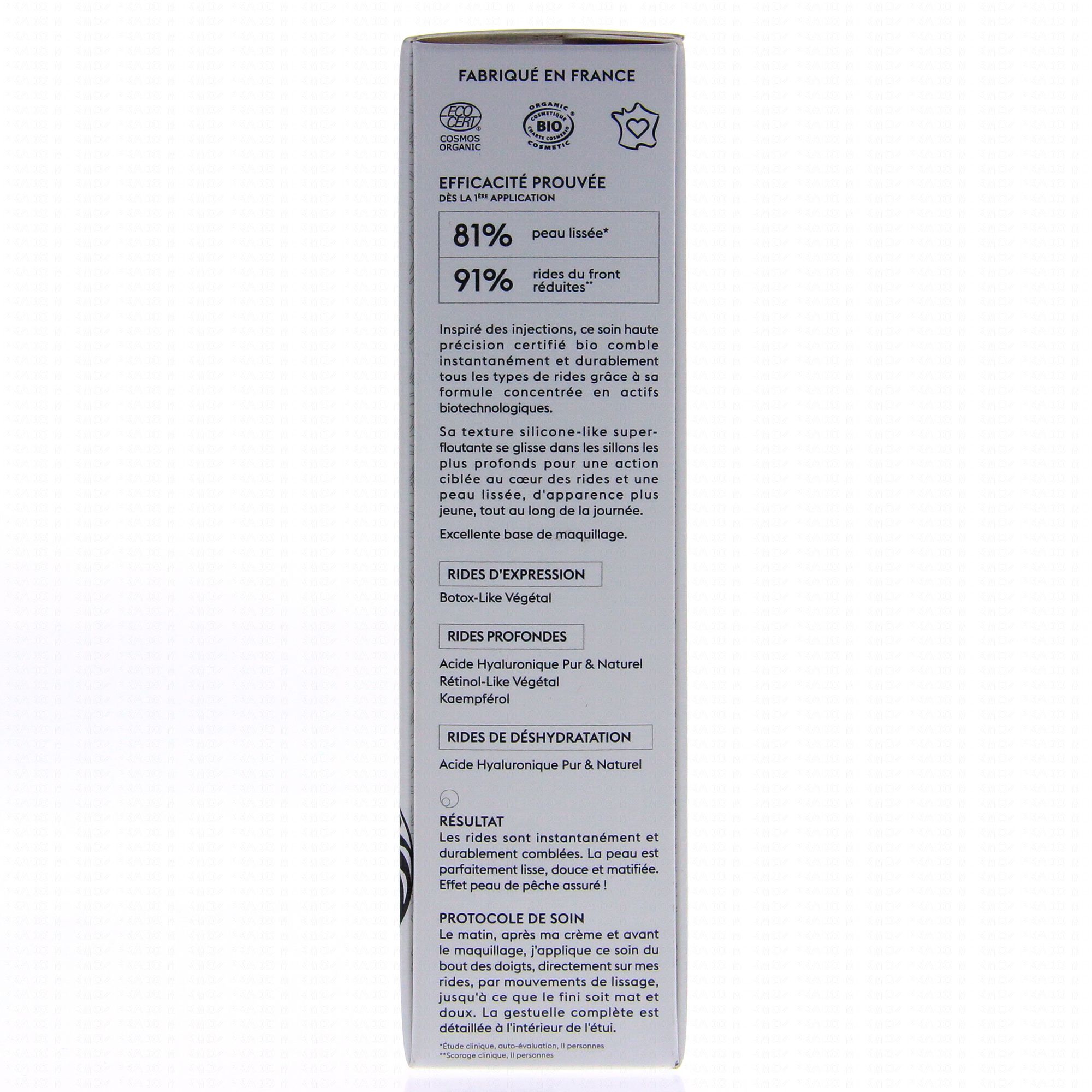 Inspiré des injections, ce soin Haute Précision comble instantanément et durablement tous les types de rides grâce à sa formule concentrée en actifs biotechnologiques : le Botox-Like Végétal et l'Acide Hyaluronique Pur & Naturel de Bas Poids Moléculaire, le duo infaillible contre les rides.