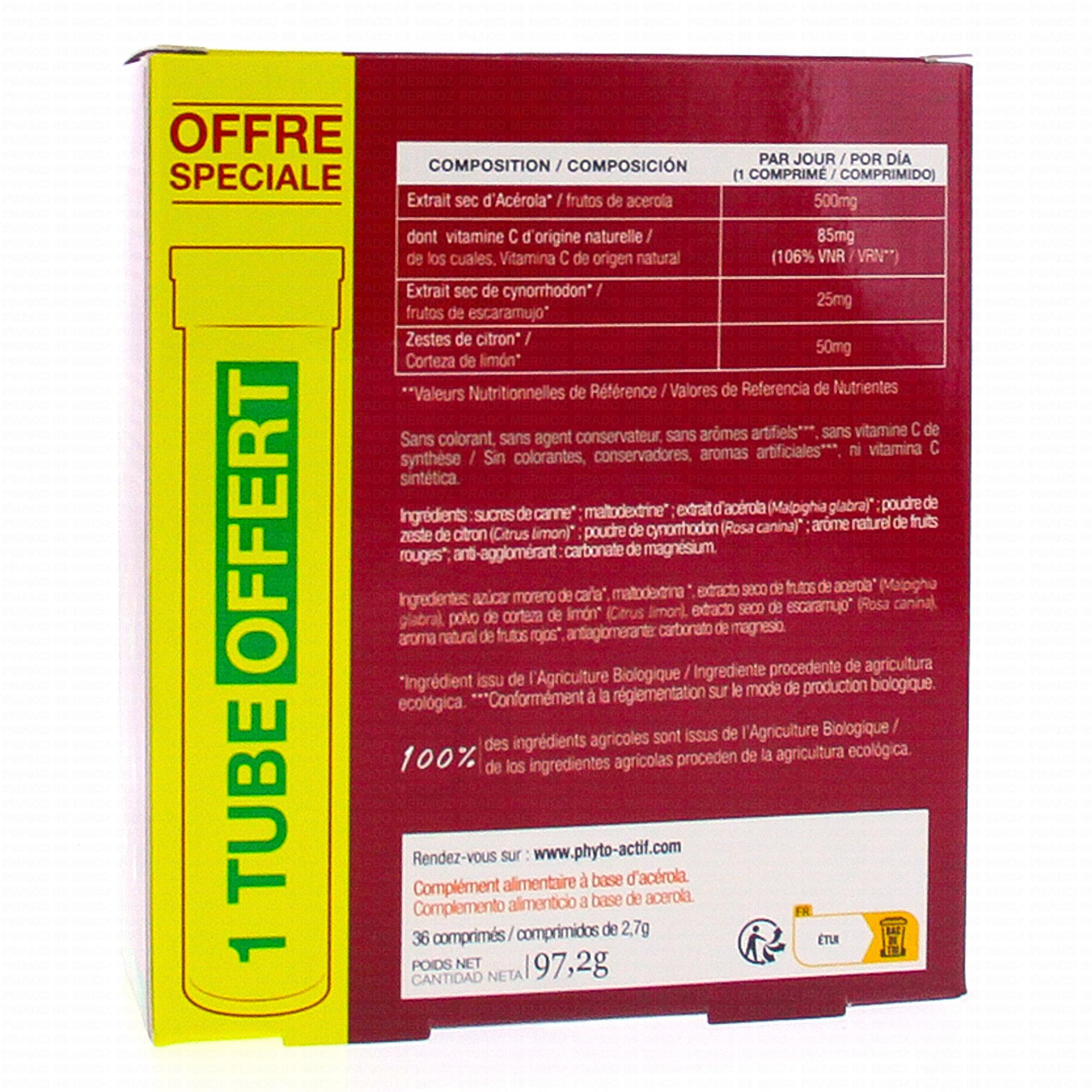 PHYTOACTIF Acerola bio 500 + un tube OFFERT 36 comprimés contient les éléments suivants :
