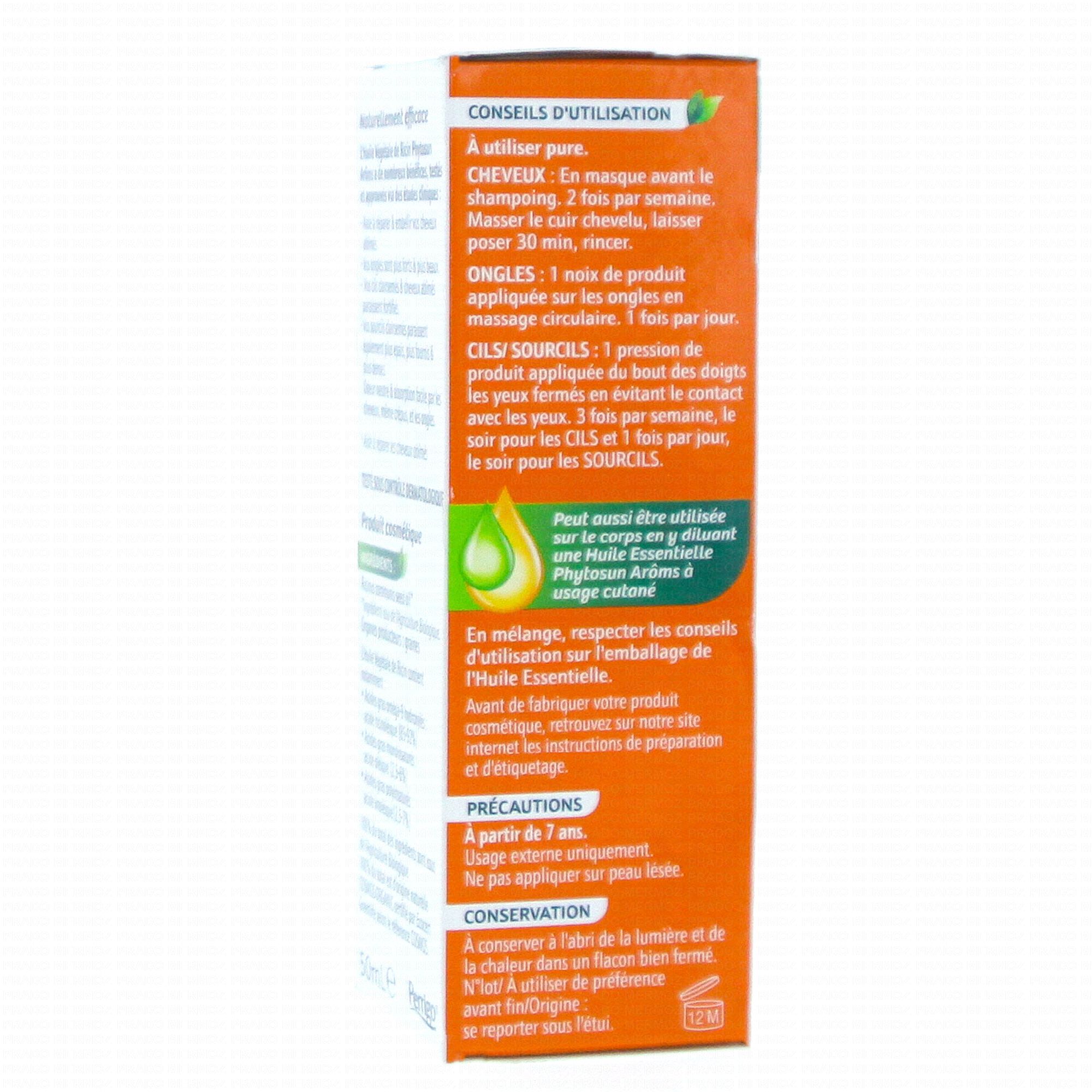 CILS/SOURCILS : 1 pression de produit appliquée du bout des doigts les yeux fermés en évitant le contact avec les yeux. 3 fois par semaine, le soir pour les CILS et 1 fois par jour, le soir pour les SOURCILS. Peut aussi être utilisée sur le corps pour diluer une Huile Essentielle Phytosun Arôms à usage cutané. En mélange, respecter les conseils d'utilisation sur l'emballage de l'Huile Essentielle. Avant de fabriquer votre produit cosmétique, retrouvez sur notre site internet les instructions de préparation et d'étiquetage.