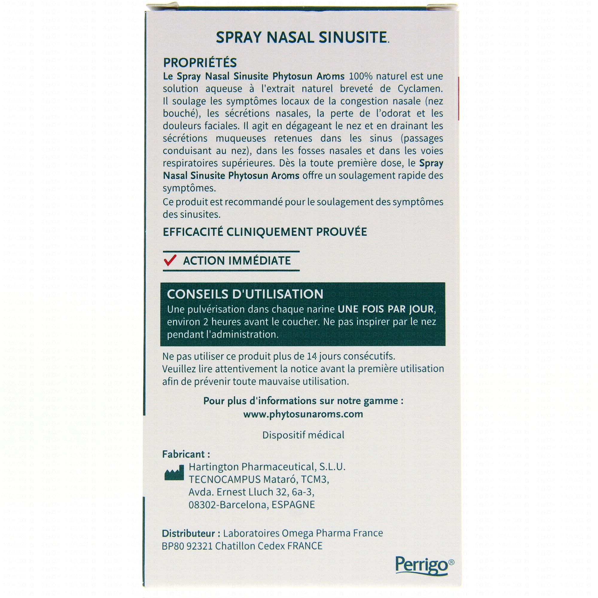 Le spray Nasal Sinusite Phytosun Arôms est 100% naturel, c'est une solution aqueuse à l'extrait naturel breveté de cyclamen. Le spray Nasal Sinusite Phytosun Arôms soulage les symptômes locaux de la congestion nasale (nez bouché), les sécrétions nasales, la perte de l'odorat et les douleurs faciales. Il agit rapidement en dégageant le nez et en drainant les sécrétions des muqueuses retenues dans les sinus (passages conduisant au nez), dans les fosses nasales et dans les voies respiratoires supérieures. Dès la toute première dose, ce spray Nasal Sinusite Phytosun arôms offre un soulagement rapide des symptômes. Ce spray est recommandé pour le soulagement des symptômes des sinusites.