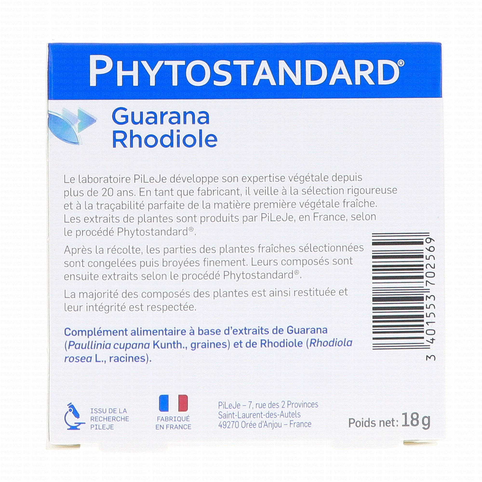 PILEJE Phytostandard de guarana et rhodiole 30 comprimés grâce à l'association guarana et rhodiola joue un rôle dans la réduction de la fatigue mentale, dans le tonus et les capacités de concentration et soutient les fonctions adaptogènes de l'organisme.