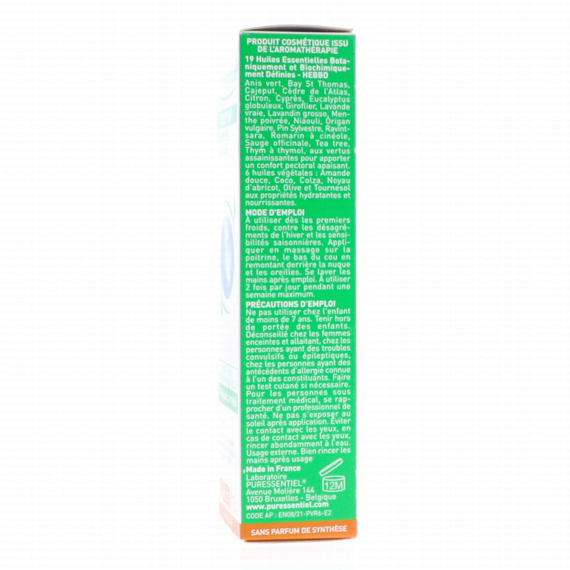 Le Baume Respiratoire aux 19 Huiles Essentielles Puressentiel est formulé à base de l'association de 19 Huiles Essentielles reconnues pour leurs propriétés assainissantes des voies respiratoires. Aux vertus antiseptiques, assainissantes, antibactériennes et apaisantes. Huiles essentielles 100 % naturelles. Aide à dégager les voies respiratoires, prévient les infections et renforce les défenses naturelles. Sans colorant, sans conservateur, sans parfum de synthèse, sans huile minérale. Conditionnement : tube plastique, étui carton.