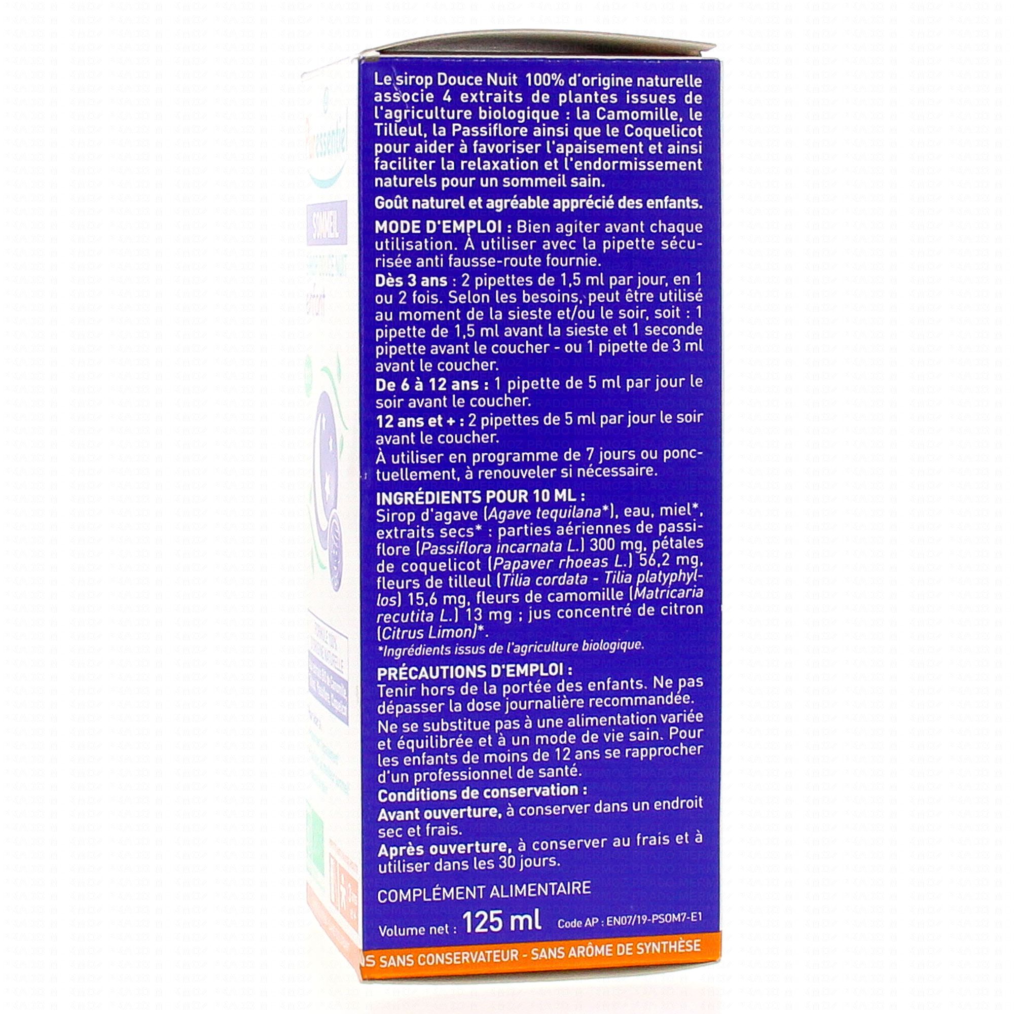 Le sirop Douce Nuit est un complément alimentaire 100% d'origine naturelle associe 4 extraits de plantes issues de l'agriculture biologique : la Camomille, le Tilleul, la Passiflore ainsi que le Coquelicot pour aider à favoriser l'apaisement et ainsi faciliter la relaxation et l'endormissement naturels pour un sommeil sain.