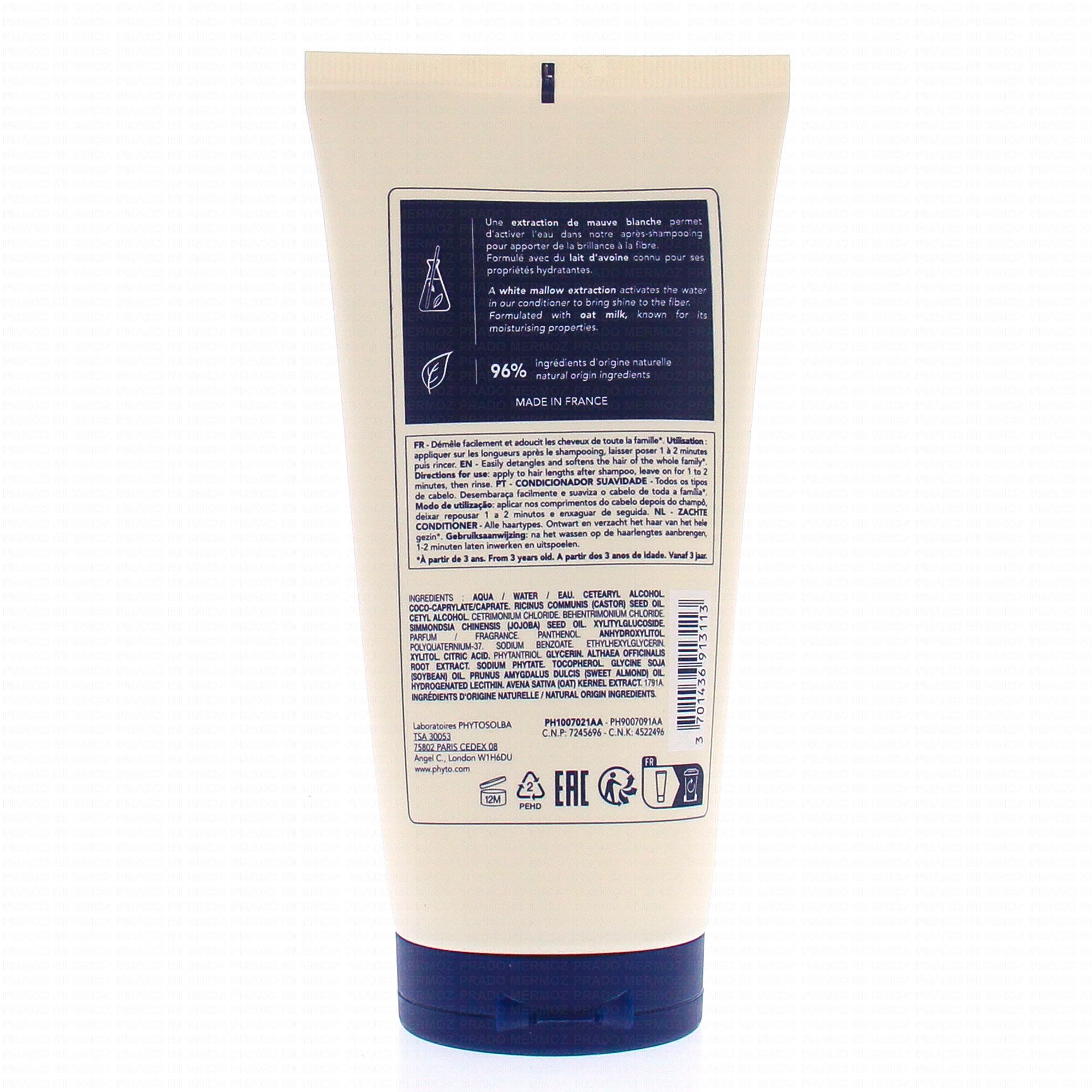 L'après shampoing Phyto douceur démêle et adoucit vos cheveux grâce à sa formule composée de 96% d'ingrédients d'origine naturelle. L'extraction de mauve blanche favorise la brillance du cheveux et sa douceur. Avec Phyto douceur, vous retrouvez des cheveux soyeux.