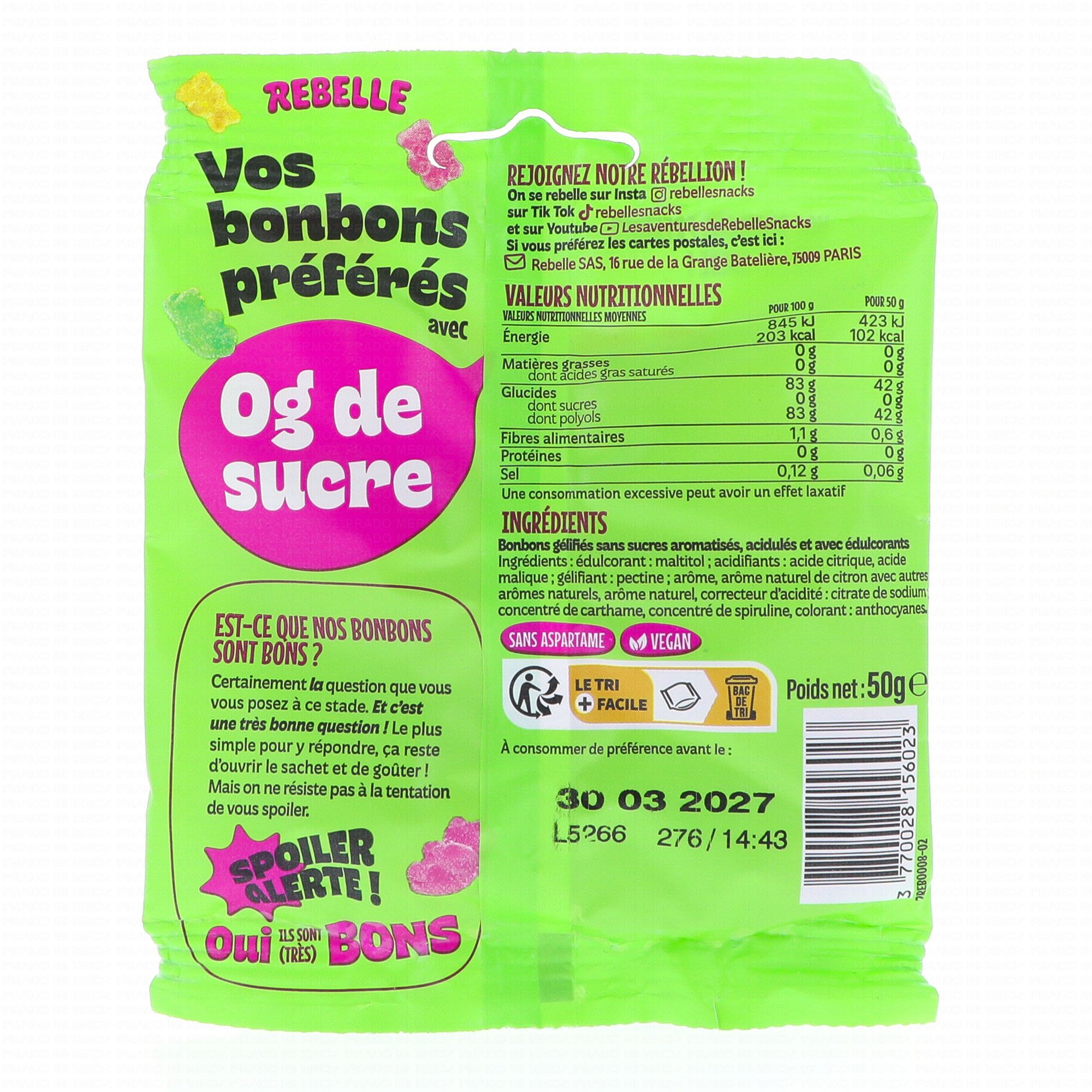 Les bonbons Rebelle sont des bonbons aux arômes naturels, sans sucres, sans gélatine animale, au goût framboise, pomme et citron, végan et fabriqué en France.