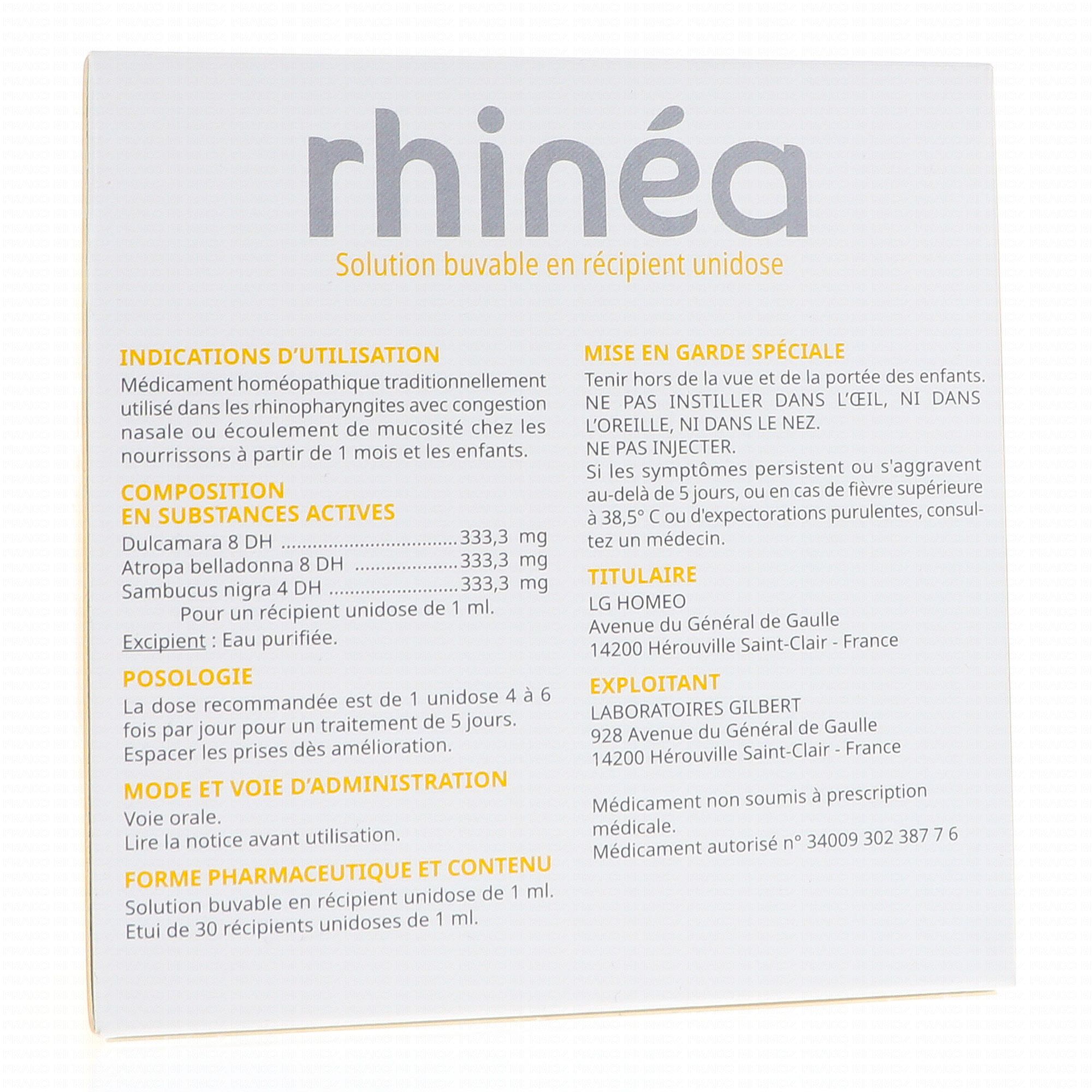 RHINEA, solution buvable en récipient unidose est un médicament homéopathique traditionnellement utilisé dans les rhinopharyngites avec congestion nasale ou écoulement de mucosité.