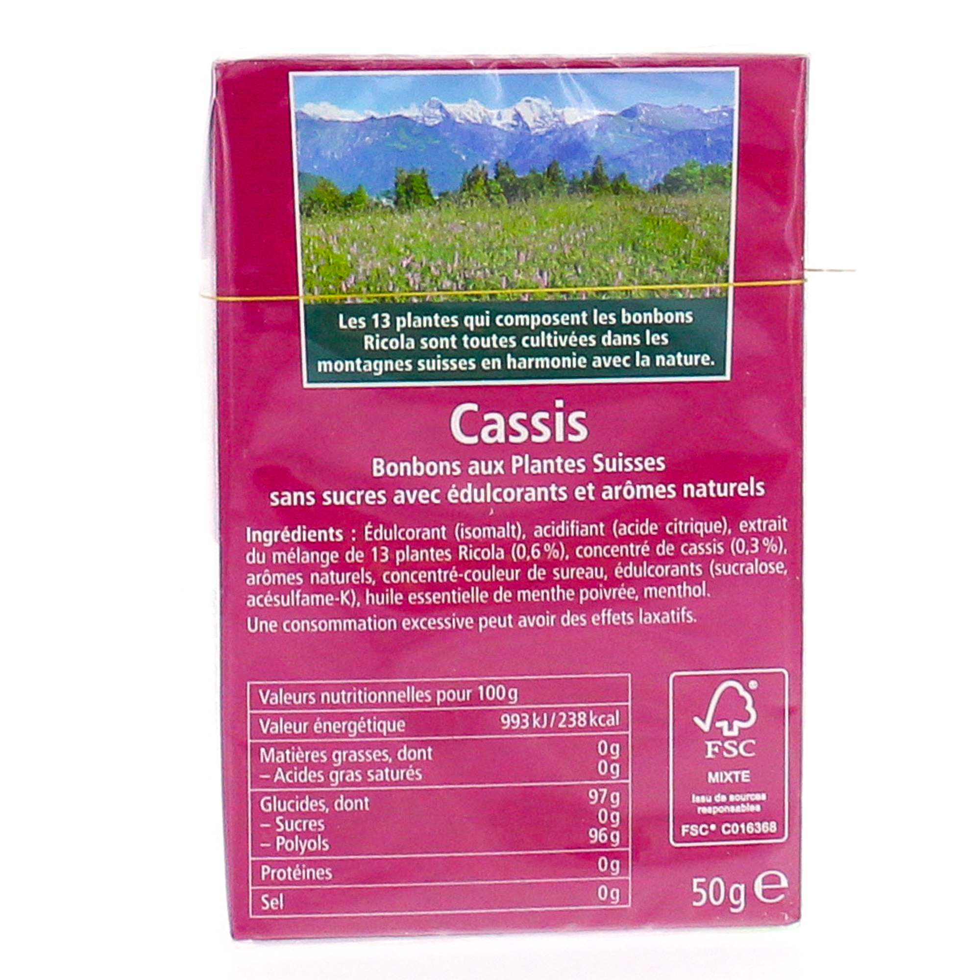 Isomalt, acidifiant (acide citrique), extrait (0,6 %) du mélange de 13 plantes Ricola, concentré de cassis (0,3 %), arômes naturels, concentré de sureau, édulcorants (aspartame ou sucralose, acésulfame-K), arôme naturel de menthes, menthol. Valeurs nutritionnelles pour 100 g.