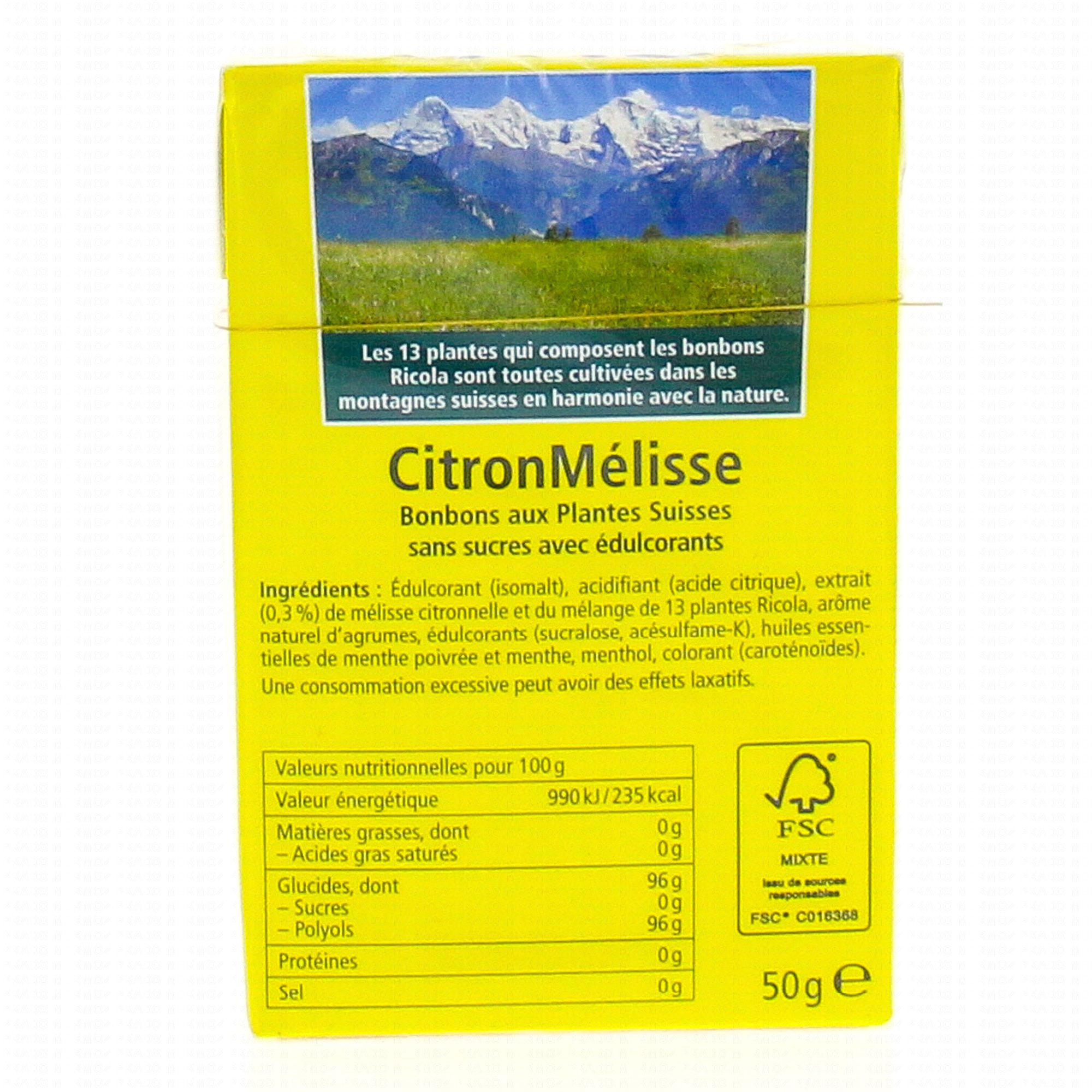 Isomalt, acidifiant (acide citrique), extrait (0,3 %) de mélisse citronnelle et du mélange de 13 plantes Ricola, arome naturel d'agrumes, édulcorants (sucralose, acésulfame-K), arome naturel de menthes, menthol, colorant (caroténoides).