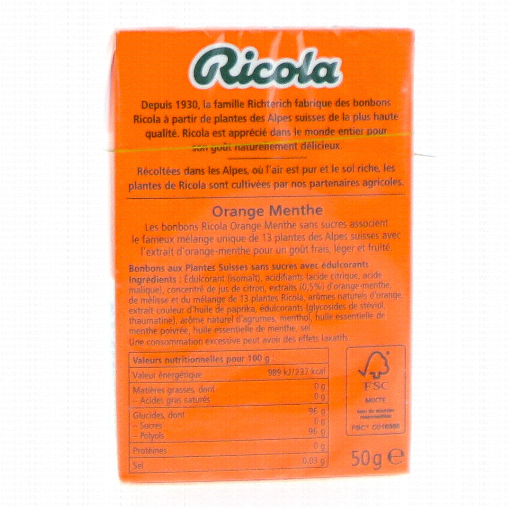 Edulcorant (isomalt), acidifiants (acide citrique, acide malique), concentré de jus de citron, extraits (0,5 %) d'orange-menthe, de mélisse et du mélange de 13 plantes Ricola, aromes naturels d'orange, extrait-couleur d'huile de paprika, édulcorant (glycosides de stéviol), arome naturel d'agrumes, menthol, huile essentielle de menthe poivrée, huile essentielle de menthe, sel.