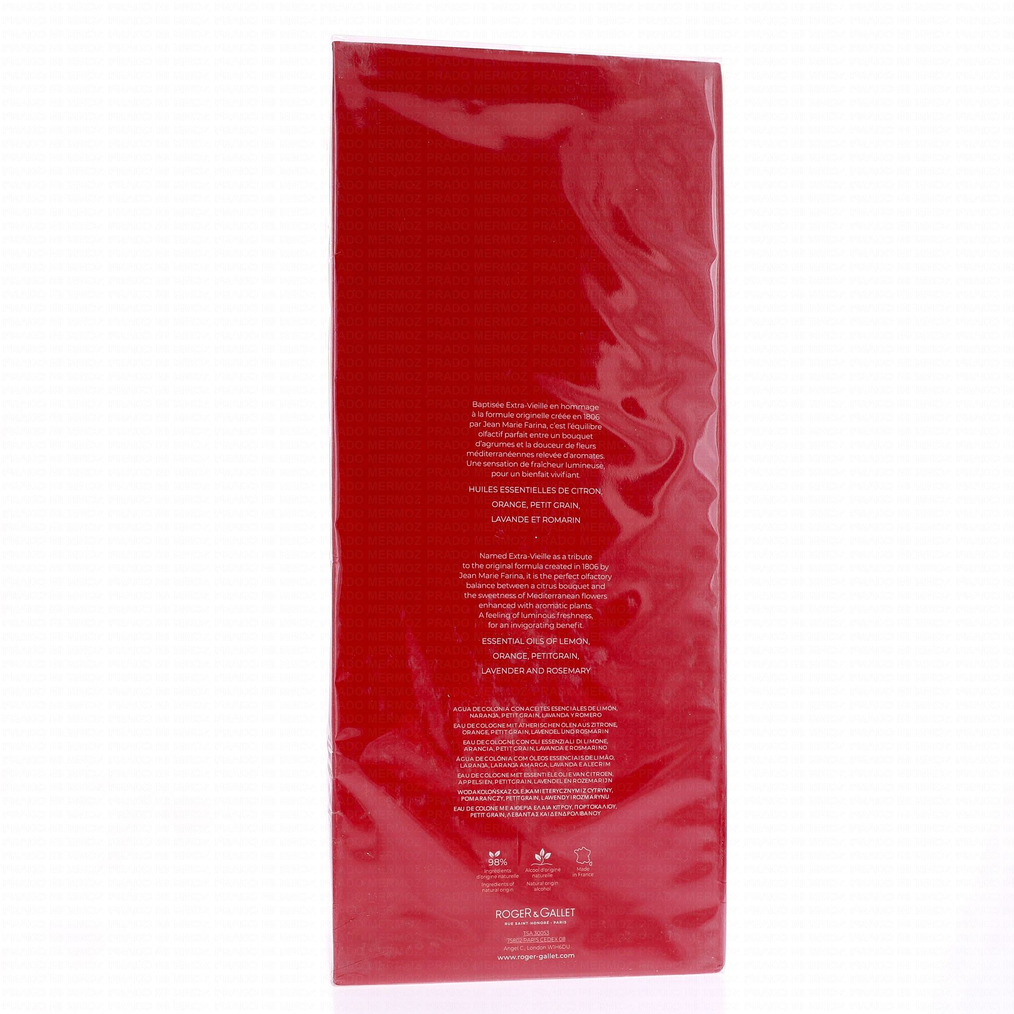 Composée à base d'essences naturelles d'agrumes et d'huiles essentielles aromatiques, l'eau de cologne Extra Vieille Roger & Gallet offre une sensation de bien être relaxant. Riche en essences naturelles d'agrumes et en huiles essentielles aromatiques. Composition tonique et relaxante, citron, petit-grain, romarin, néroli apportent une exquise sensation de fraîcheur et laissent sur la peau le délicat parfum de son accord hespéridé et agreste.