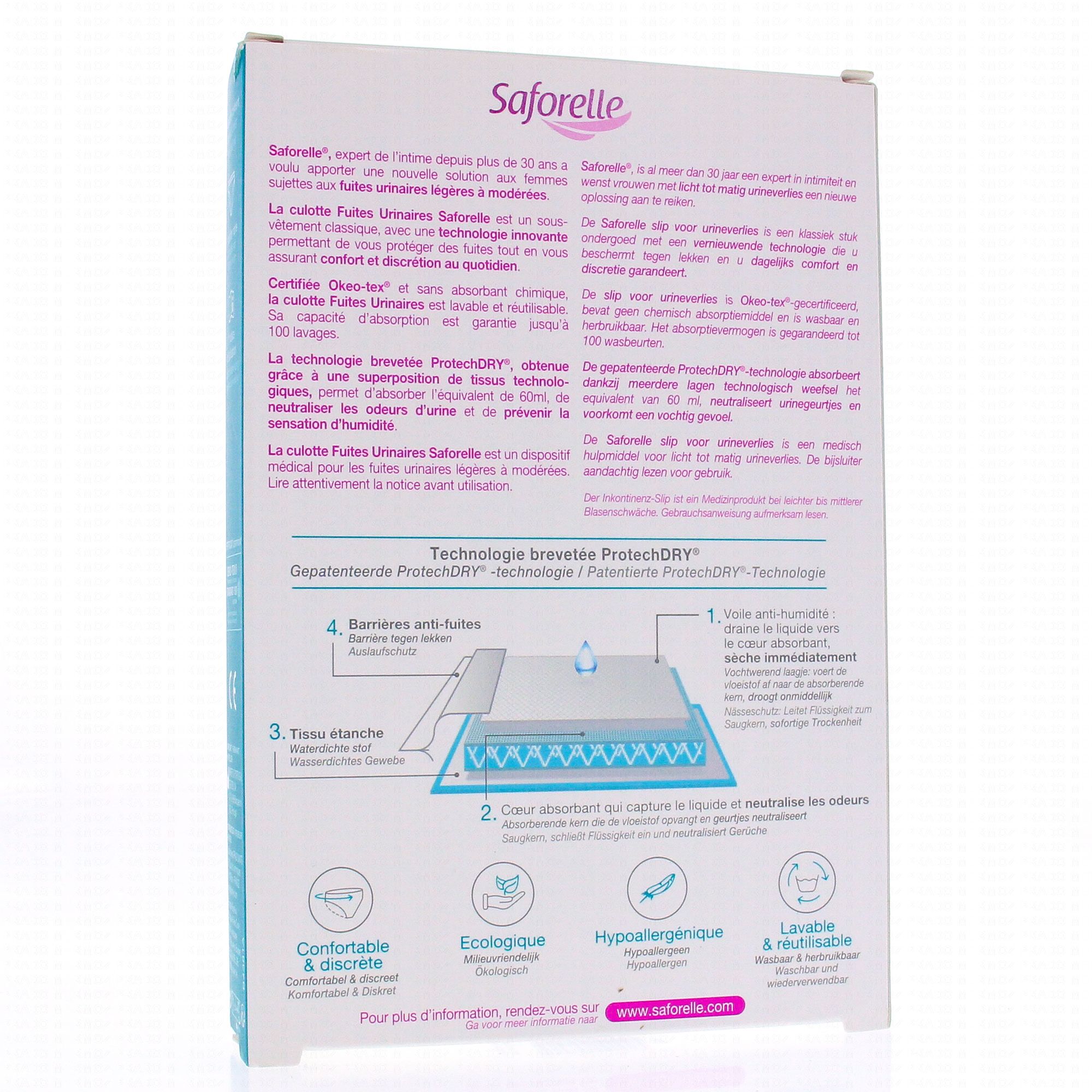 Contrairement aux idées reçues, les fuites urinaires peuvent concerner toutes les femmes. Saforelle révolutionne la vie des femmes grâce à son innovation : la Culotte pour les Fuites Urinaires Saforelle® ! Ce sous-vêtement classique, en coton, est doté d'une technologie innovante permettant de vous protéger des fuites légères à modérées tout en vous assurant confort et discrétion au quotidien. La technologie brevetée ProtechDRY® protège des fuites tout en assurant confort et discretion. Ultra-fine et confortable, lavable et réutilisable, certifié Oeko-tex elle permet de libérer toutes les femmes !