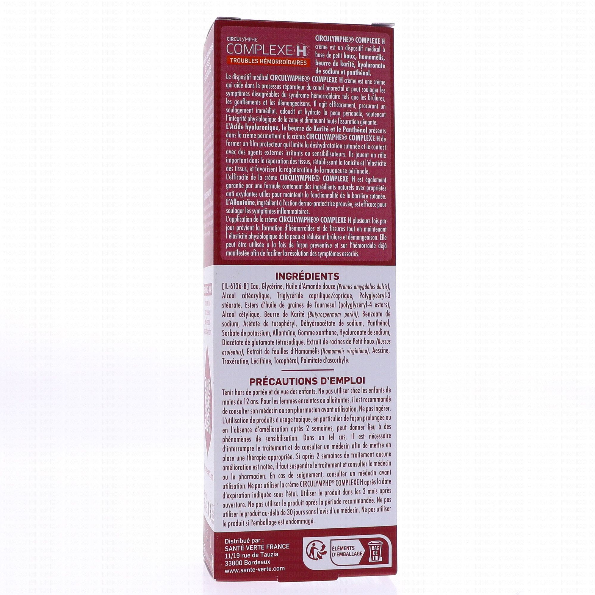 Laver avec précaution et sécher délicatement la zone à traiter puis appliquer, en utilisant la canule), une petite quantité de la crème équivalent à une dose de produit. Répéter périodiquement l'application si possible après chaque évacuation et après la toilette quotidienne, et chaque fois que les symptômes deviennent gênants. Il est possible de répéter le traitement jusqu'à 3 à 4 fois par jour. Après utilisation du produit, éviter le contact avec les yeux et se laver soigneusement les mains. Tenir hors de portée et de vue des enfants. Convient aux femmes allaitantes. Le produit peut être utilisé chez les femmes enceintes, il est cependant recommandé de consulter son médecin avant utilisation. ne pas ingérer. Ne pas utiliser la crème Circulymphe Complexe H après la date d'expiration indiquée sur l'emballage. Utiliser le produit dans les 3 mois après l'ouverture. Ne pas utiliser le produit après la période recommandée. L'utilisation de produit à usage topique, en particulier de façon prolongée, peut donner lieu à des phénomènes de sensibilisation. Dans un tel cas, il est nécessaire d'interrompre le traitement et de consulter un médecin afin de mettre en place une thérapie appropriée. Conserver à température ambiante et loin de toute source de chaleur. En cas de saignement, consulter un médecin avant utilisation. Si les symptômes persistent après le traitement, consulter un médecin.