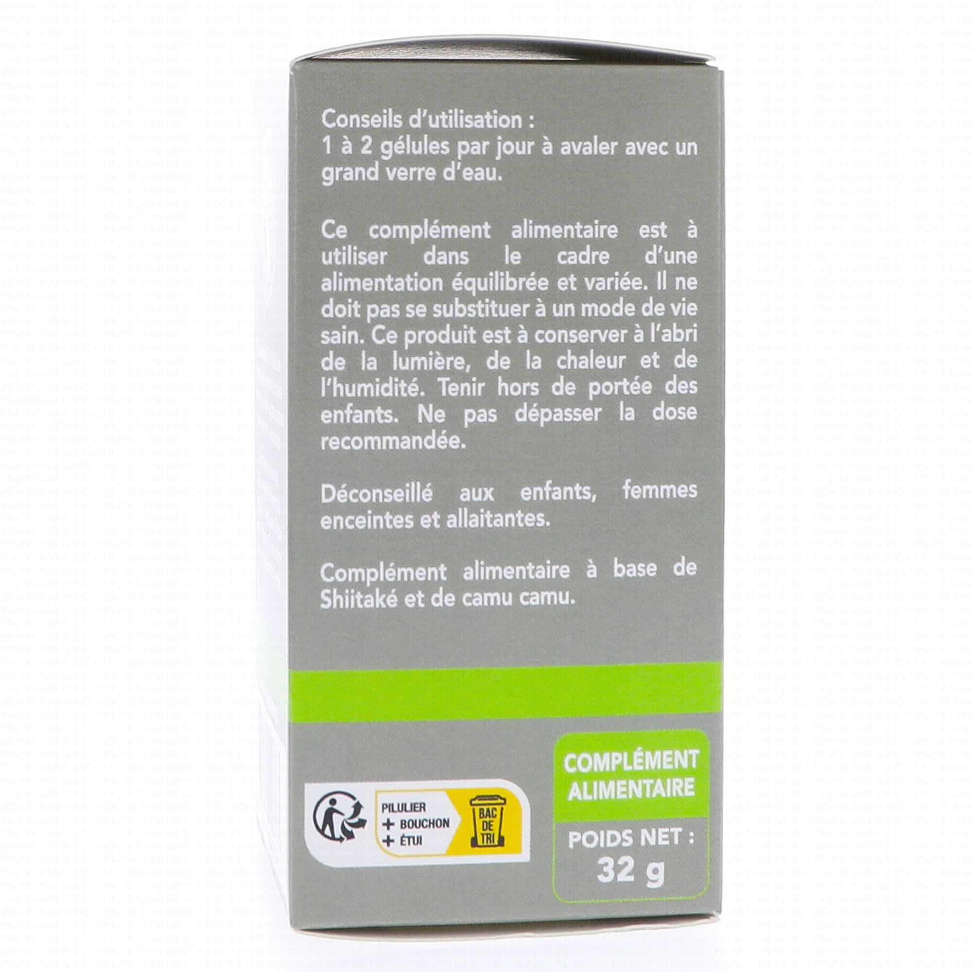 Pour 1 gélule : extrait sec de Shiitaké (300 mg) dont polysaccharides (45 mg) ; extrait sec de Camu Camu (25 mg) dont vitamine C (12,5 mg soit 15,62 % des apports de référence)