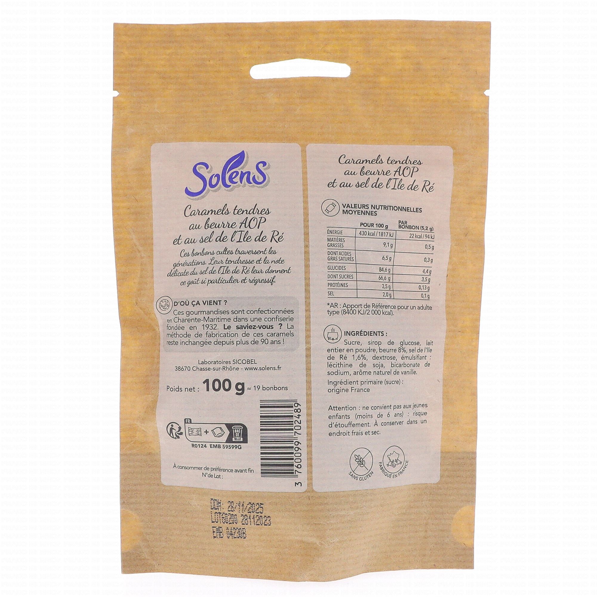 Sucre, sirop de glucose, lait entier en poudre, beurre 8%, sel de l'Ile de Ré 1,6%, dextrose, émulsifiant : lécithine de soja, bicarbonate de sodium, arôme naturel de vanille