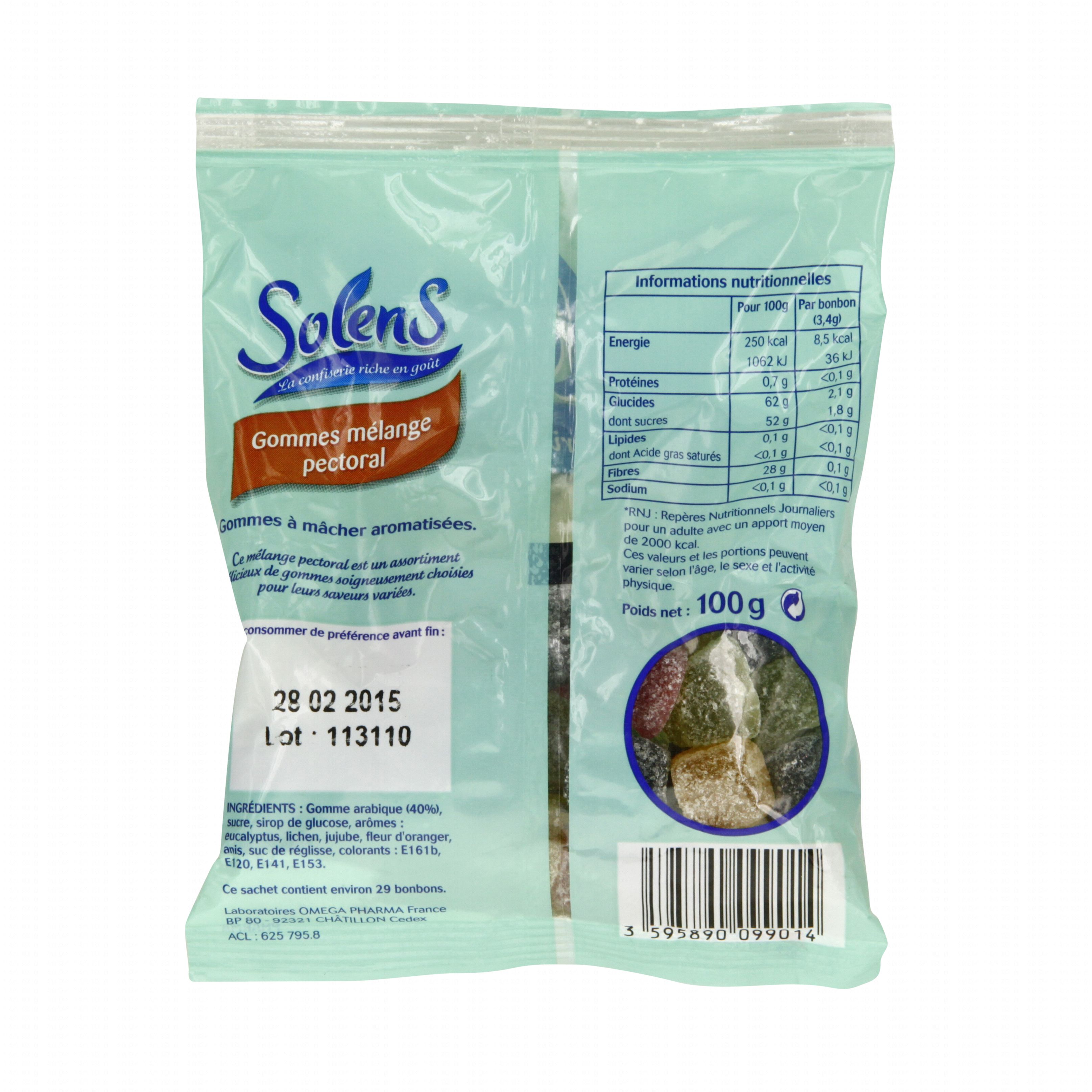 Solens propose un mélange pectoral de gommes à mâcher: réglisse, eucalyptus, jujube, lichen. Délicieuses et formulées sans colorant, les gommes Solens apportent plaisir et douceur à toutes les papilles. Sans colorant.