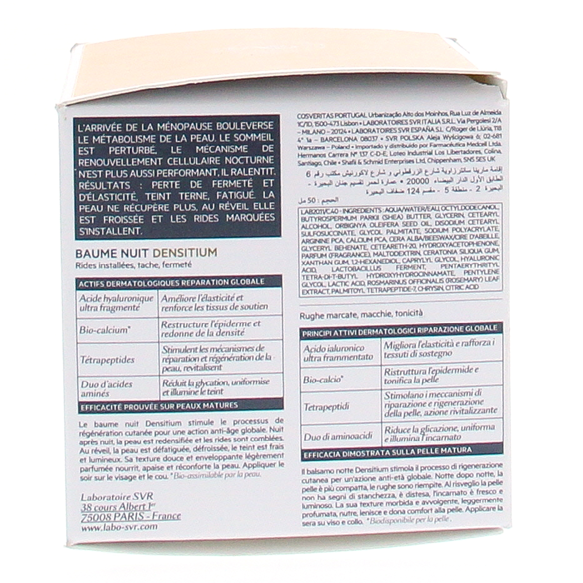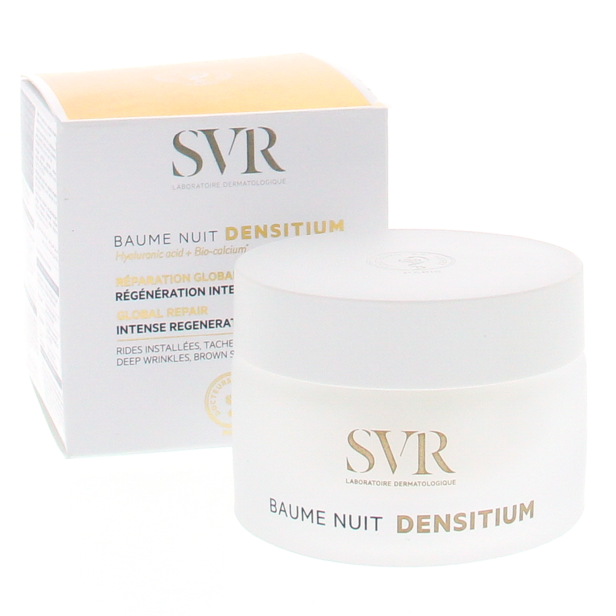 SVR Densitium Baume Nuit 50ml est un baume de nuit régénérant intensif pour les peaux matures. Il agit sur les rides profondes, l'hyperpigmentation et raffermit la peau, tout en stimulant le processus de renouvellement cutané pour une action anti-âge complète. Nuit après nuit, la peau se retend et le rides se comblent. La peau est lissée, fraîche et le teint est éclatant. Ce baume apaise et nourrit la peau, tout en lui procurant une sensation de confort, accompagnée d'un doux parfum.